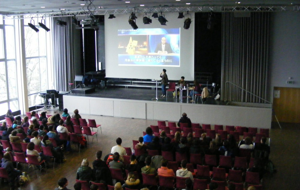 Der Fokus der Vortrags lag darauf, dass das Thema Fukushima und die Situation in den durch Strahlung belasteten Gebieten in der Nähe des Kraftwerks in den japanischen Medien kaum mehr präsent sind und dass unabhängiger, investigativer Journalismus es schwer hat. Die Oshidoris haben auf eigene Faust Recherchen angestrengt, mit Hunderten von unmittelbar betroffenen Menschen gesprochen und Konferenzen und Versammlungen besucht, in denen etwa Bauern aus den kontaminierten Gebieten beraten wurden. Die Referenten halten es für wichtig, die Menschen in Japan und auf der ganzen Welt gut zu informieren, damit diese ihre Entscheidungen auf einer guten Informationsgrundlage treffen können. Das Publikum hatte im Anschluss viele Fragen, und so schloss sich eine rege Diskussionsrunde an den Vortrag an. Einige Publikumsmitglieder fragten sogar gleich direkt auf Japanisch.