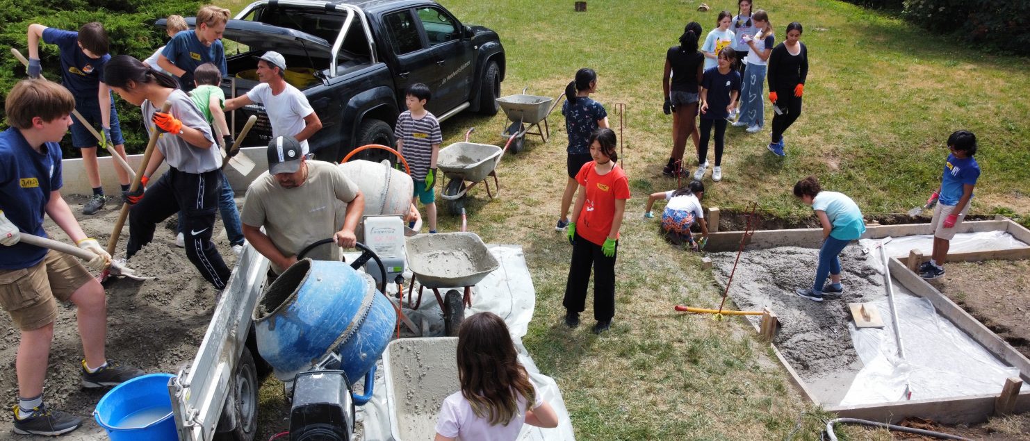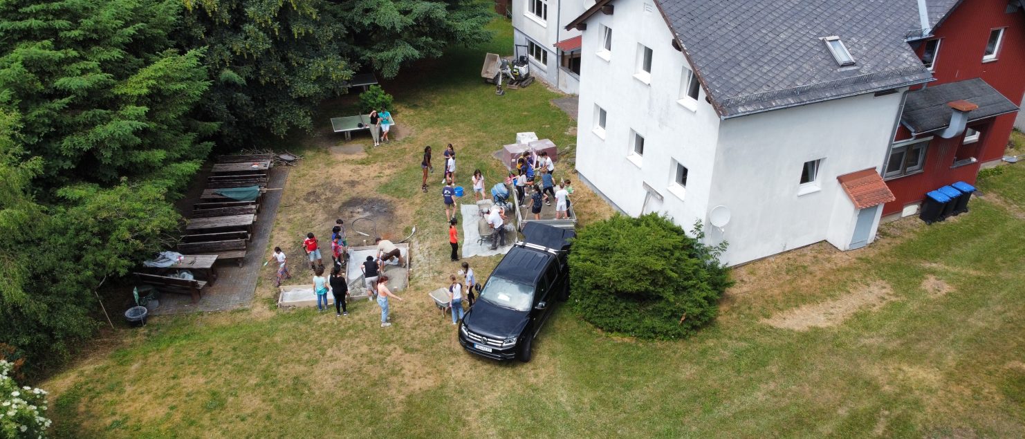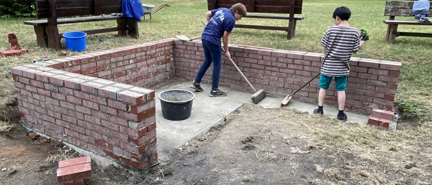 Vom 27.06. bis zum 30.06.2023 baute wir, die Klasse 6a, den Grundstein für einen Outdoor-Pizzaofen für unser Schullandheim: Gemeinsam mit Frau Dr. Steiner, Herr Dr. Steiner und dem Landschaftsbauer Herr Zwick haben wir gelernt, wie man Beton mischt und ein bewehrtes Plattenfundament erstellt. Dann mussten wir den Beton einen Tag trocknen lassen, damit er auch richtig fest wird. Am nächsten Tag konnten wir mit dem Mauern beginnen: Zuerst wurde die erste Reihe mit Mörtel gesetzt, das hat richtig viel Zeit gekostet, weil die Steine ganz gerade gesetzt werden mussten und sich durch den Mörtel etwas bewegten. Dann haben wir es geschafft, die Außenmauern des Tisches, auf dem der Pizzaofen stehen wird, auf die richtige Höhe zu mauern. Als nächste Schritte muss noch eine Platte auf die Mauer und dann der Ofen darauf gesetzt werden. Wir freuen uns schon darauf, dass wir alle bald leckere Pizza aus dem Ofen essen können!