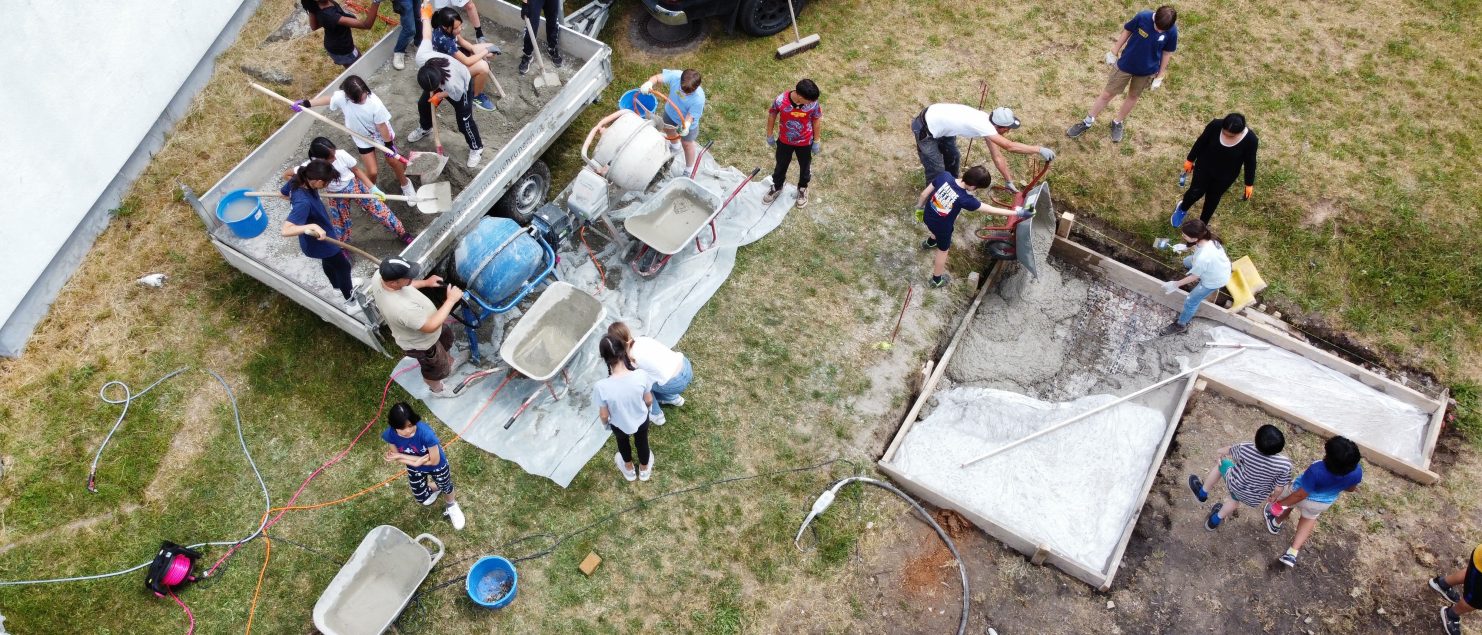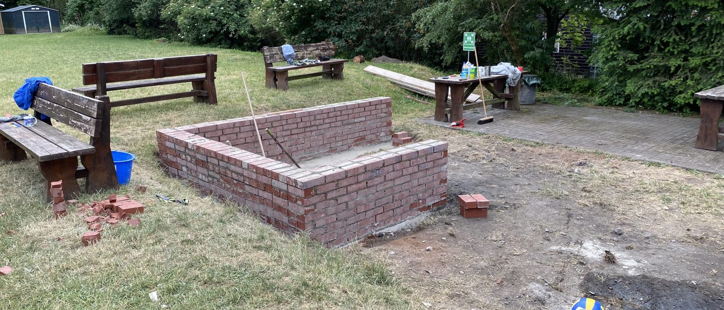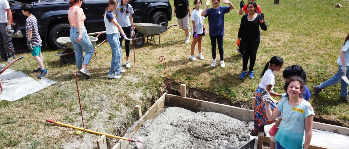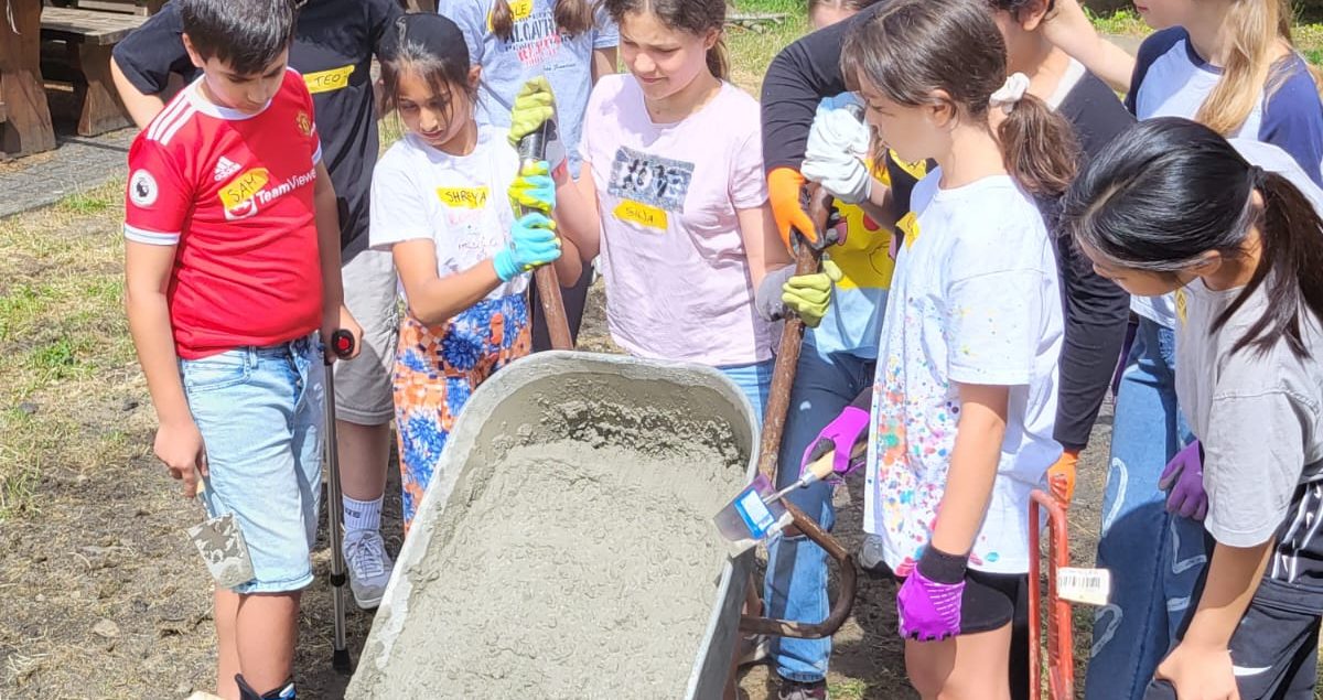 Vom 27.06. bis zum 30.06.2023 baute wir, die Klasse 6a, den Grundstein für einen Outdoor-Pizzaofen für unser Schullandheim: Gemeinsam mit Frau Dr. Steiner, Herr Dr. Steiner und dem Landschaftsbauer Herr Zwick haben wir gelernt, wie man Beton mischt und ein bewehrtes Plattenfundament erstellt. Dann mussten wir den Beton einen Tag trocknen lassen, damit er auch richtig fest wird. Am nächsten Tag konnten wir mit dem Mauern beginnen: Zuerst wurde die erste Reihe mit Mörtel gesetzt, das hat richtig viel Zeit gekostet, weil die Steine ganz gerade gesetzt werden mussten und sich durch den Mörtel etwas bewegten. Dann haben wir es geschafft, die Außenmauern des Tisches, auf dem der Pizzaofen stehen wird, auf die richtige Höhe zu mauern. Als nächste Schritte muss noch eine Platte auf die Mauer und dann der Ofen darauf gesetzt werden. Wir freuen uns schon darauf, dass wir alle bald leckere Pizza aus dem Ofen essen können!