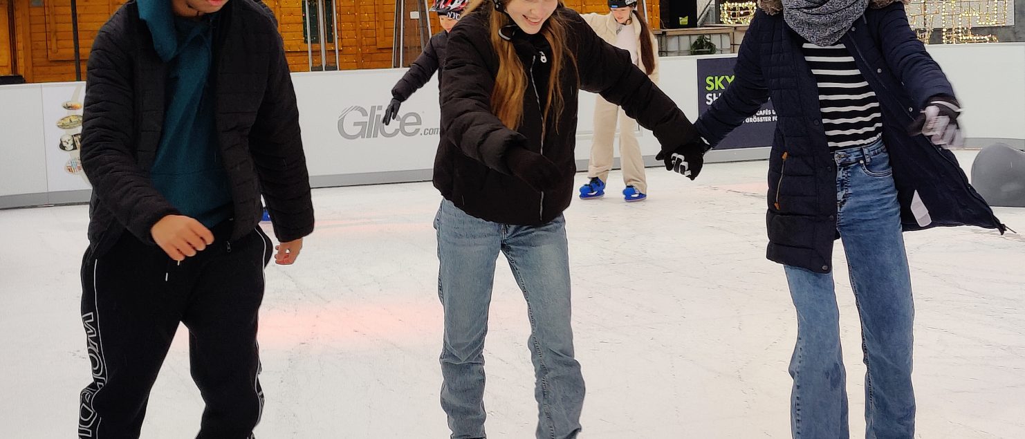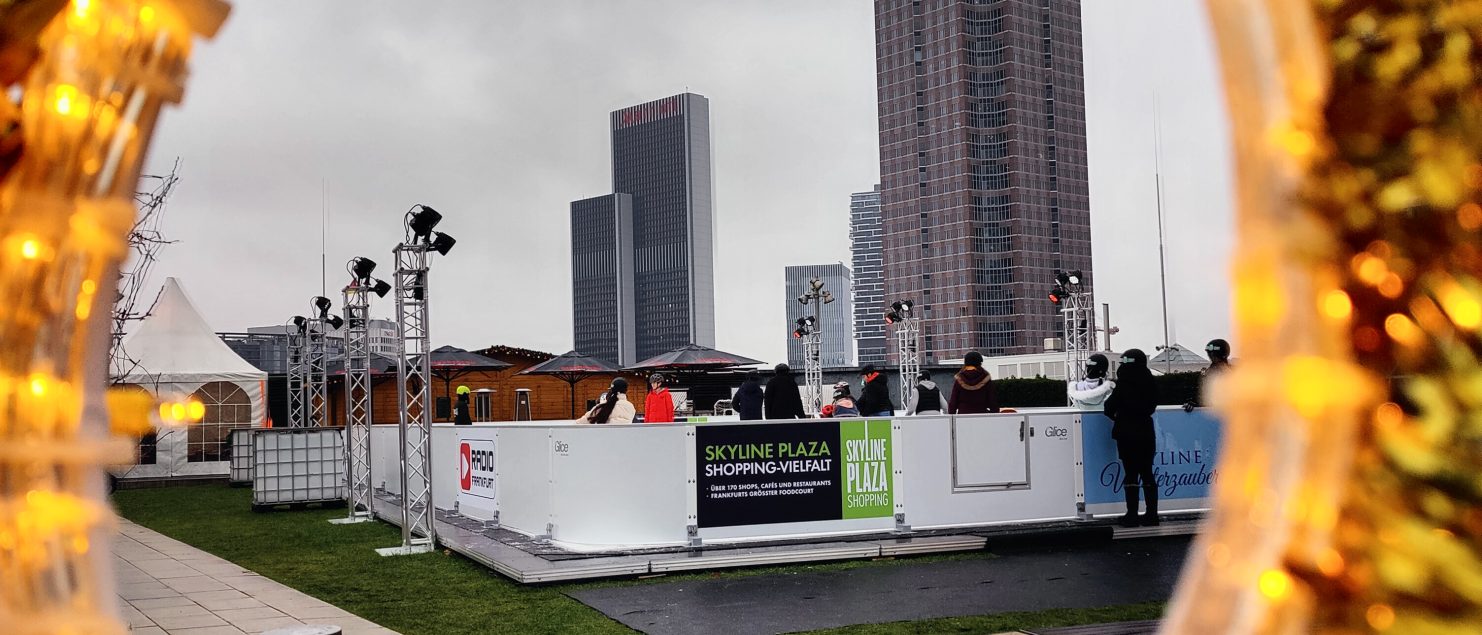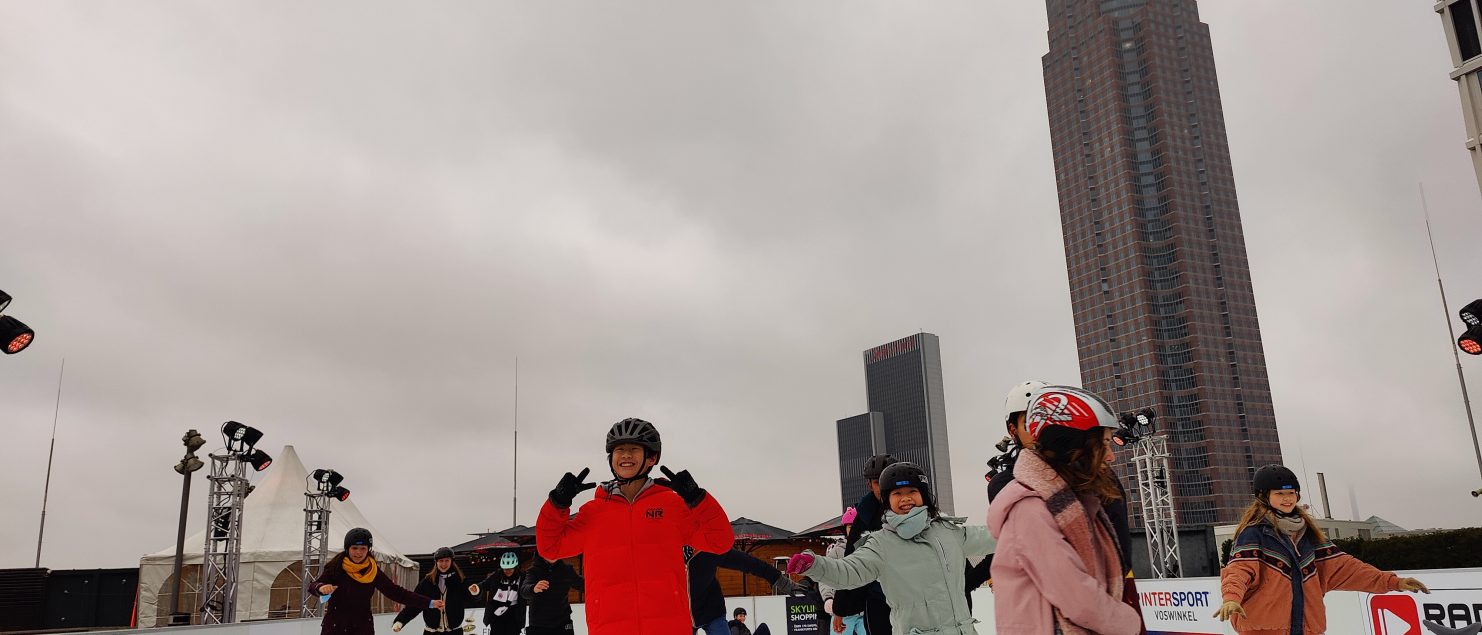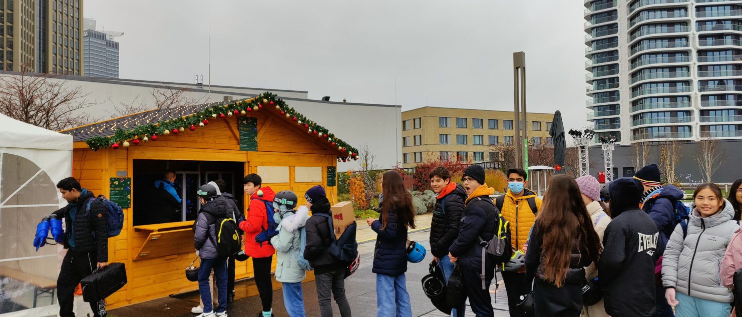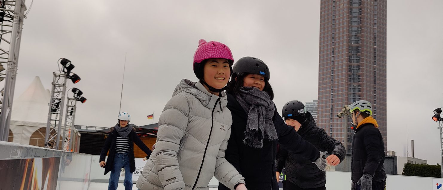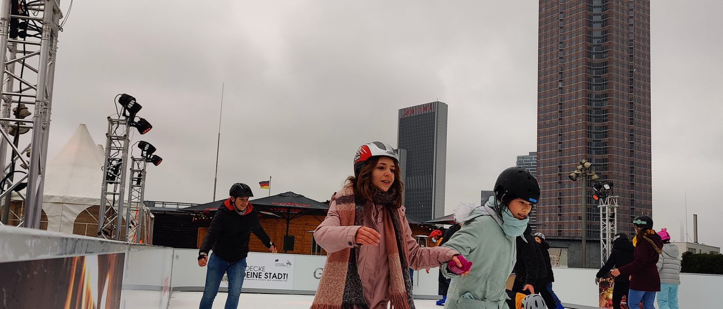Am 02.12.2022 durfte die 8a mit ihrem Sportlehrer Herrn Schönberg die im Rahmen des Programms „Winterzauber – rauf auf’s Eis!“ aufgebaute Kunststoffeisbahn auf dem Dachgarten des Skyline Plaza einweihen – und damit noch weit vor Öffnung für das Publikum in den Genuss kommen, eine ökologische 200qm große Schlittschuhbahn bei leichtem Schneefall und grandioser Aussicht auf die Frankfurter Skyline ausprobieren zu dürfen. Neben der kostenfreien Nutzung von Bahn und Material wurden die Lernenden bei Außentemperaturen nahe am Gefrierpunkt vom Betreiber der Bahn noch zu einem wärmenden Heißgetränk eingeladen. Sportunterricht mal anders.