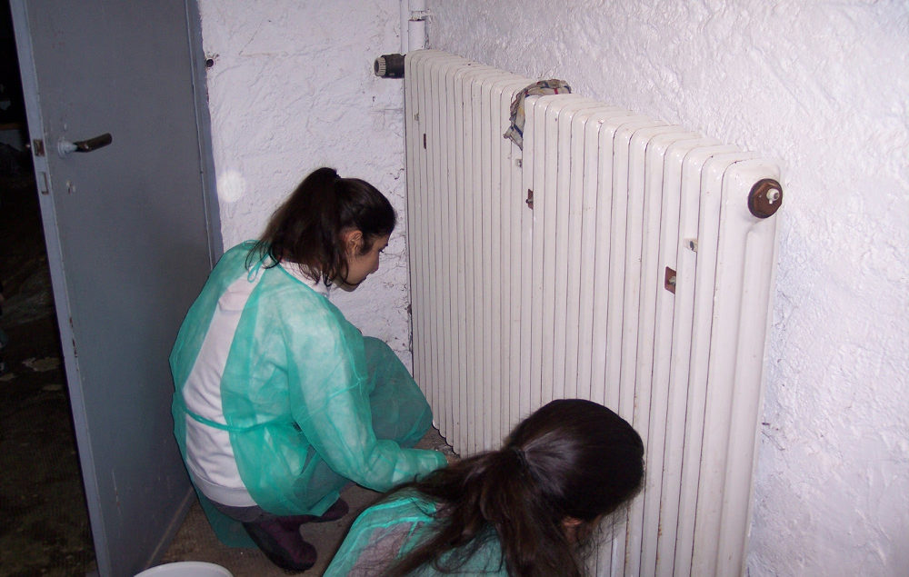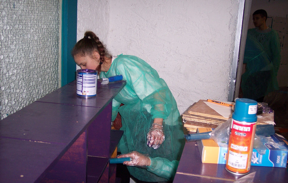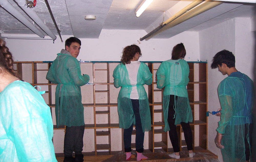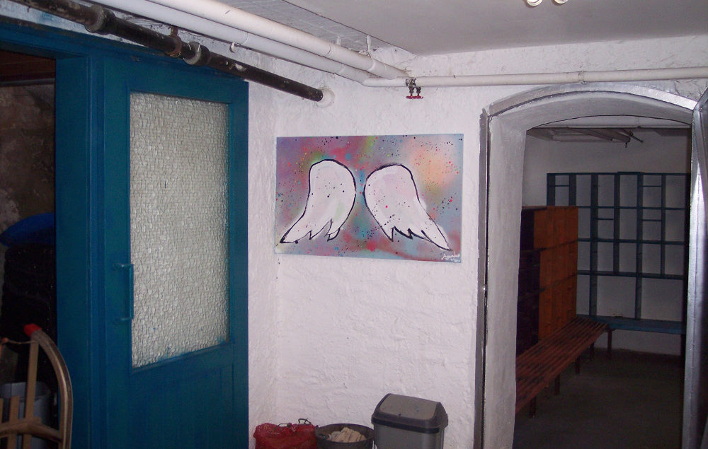 Wir, die Klasse 9c, haben während unserer letzten Klassenfahrt ins Landheim den Schuhkeller renoviert. Unsere Lehrer, Frau Neubauer und Herr Frank, haben das Material für das Renovieren besorgt und schon konnten wir die Schuhregale und Türen anschleifen. Gleichzeitig wurden die Wände gespachtelt und angestrichen. Im ehemals tristen Keller und dem Erdgeschoss durften wir unserer Kreativität freien Lauf lassen und haben Leinwände mit Graffiti angefertigt und somit die Wände mit Graffiti verschönert. Am folgenden Tag wurden die Schuhregale abmontiert und danach mit Farbe bestrichen. Die Leinwände wurden zu Ende gestaltet und im Schuhkeller aufgehängt. Jetzt ist der Keller, innerhalb einer Woche, lustig und bunt.