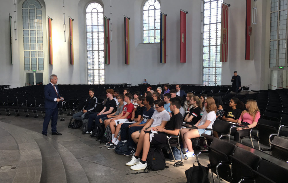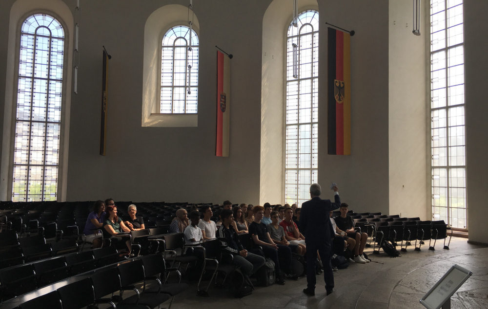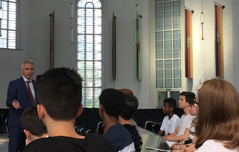Die Klasse erhielt in der Frankfurter Paulskirche von OB Feldmann höchstpersönlich einen Kurzvortrag über die Demokratie- und Migrationsgeschichte Frankfurts. Die Klasse 9d, die zuvor Fotos zu dem Thema „Demokratie und Menschenrechte“ anfertigte, zeigte sich sehr beeindruckt von der Begegnung mit dem OB und freut sich bereits auf die Ausstellung ihrer Bilder.