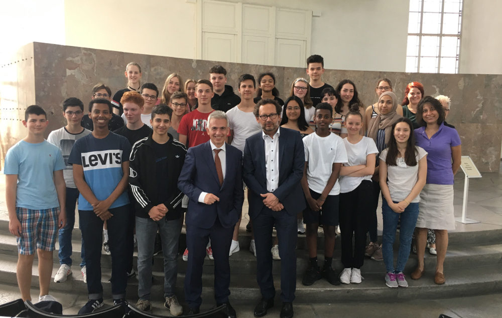 Der „Geschwister Scholl“-Geschichtskurs (Tf) der Klasse 9d durfte, im Rahmen der Unterrichtseinheit „Wiege der deutschen Demokratie – Wiege 3.0?“, Oberbürgermeister Feldmann treffen.
