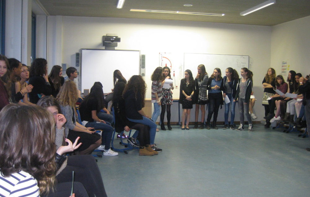 Unsere Austauschschüler aus Fontaines sur Saône bei Lyon waren vom 1.-8. März in Frankfurt. 25 Schülerinnen und Schüler der achten Klassen des Goethe-Gymnasiums und 25 Schüler/-innen der quatrième nehmen dieses Jahr am Austausch teil. Voller Spannung warten die Schüler auf die Ankunft und das erste Zusammentreffen mit den französischen Schülern. Gegen 17:00 ist es soweit. Ein französischer Bus fährt in die Ludwigstr. Nachdem die Schüler ihre Partner gefunden haben, geht es zu einer ersten Begrüßungsrunde in die Schule. Beim Speed-dating lernt man die ganze Gruppe erst mal kennen. Nach und nach weicht die Anspannung und eine fröhliche Neugier macht sich breit. Während einer Woche werden unter dem Thema „WIR“ verschiedene Themen bearbeitet und am letzten Abend in deutsch-französischen Teams präsentiert.. In Schloss Freudenberg gibt es viele Experimente, die das Wir-Gefühl stärken und zeigen, dass wir alle voneinander abhängig sind und nur in gemeinsamer Absprache Dinge bewegen können. Am Ende der Woche feiern die Schüler ausgelassen Party und freuen sich schon riesig auf den Gegenbesuch vom 18. -24 Mai in Lyon.