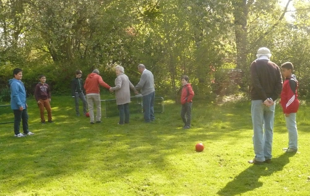 „Die Jungs der 5b wurden nach der Führung in unterschiedliche Gruppen zum Mithelfen aufgeteilt. Eine Gruppe wurde zum Beispiel in die Hauswirtschaft eingeteilt, wo die Jungs Toilettenpapier auswechseln und Wäschebeutel mit Schmutzwäsche in Container bringen sollten. Die Kinder, die in der Küche geholfen haben, haben einen leckeren Obstsalat zubereitet. Die anderen Gruppen gingen jeweils zu Bewohnern des Hauses und durften sie im Rollstuhl in den großen Garten schieben. Dort haben sie mit einem besonderen Ball gespielt, was den Menschen hilft, dass das Gedächtnis auf Vordermann bleibt.“