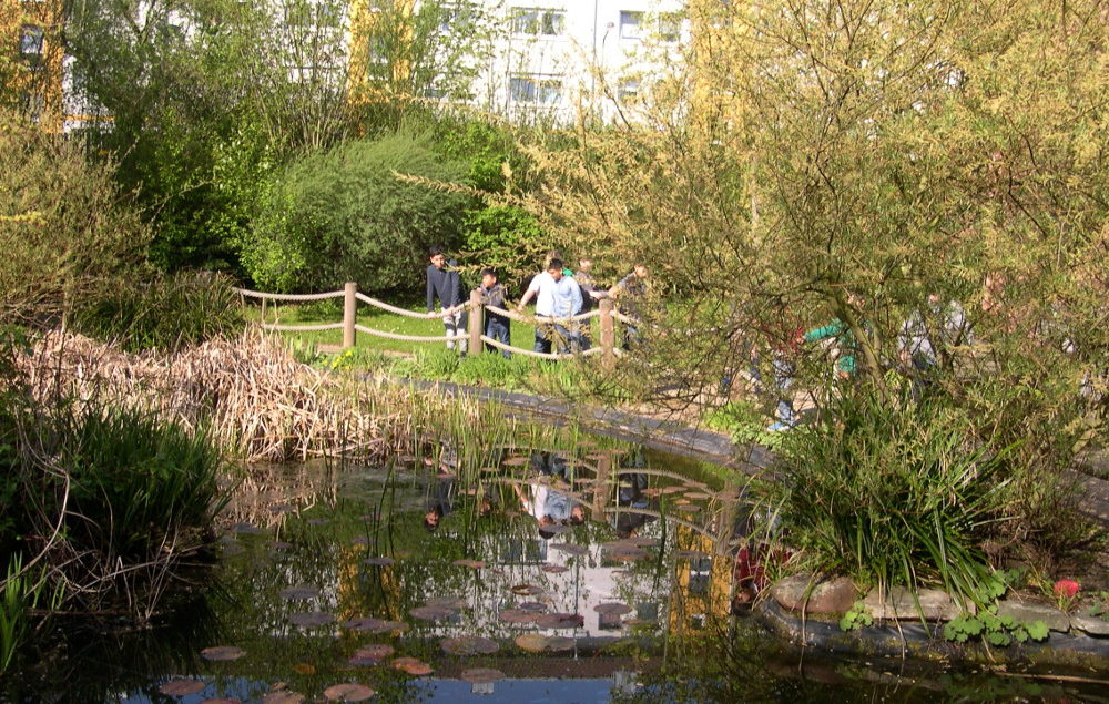 „Zuerst wurden wir von Herrn Riesenberg herumgeführt, er zeigte uns ein gewöhnliches Einbettzimmer und ein Zweibettzimmer für Menschen mit Demenz mit einer Tür zum Garten. Das ist gut so, denn wenn jemand aufwacht, ist es gut, dass er jemanden zum Sprechen hat. Anschließend gingen die Jungen der 5b in einen großen Garten, der mit vielen Blumen bepflanz ist und in dem das Gartenhaus („Ajas Gartenhaus“) steht. Dort gibt es vier Wohngruppen, in denen jeweils acht Menschen mit Demenz leben. Im Garten gibt es auch einen kleinen aber feinen Teich mit Fröschen und kleinen Fischen. Im Keller des Hauses gibt es sogar einen Laden mit Lebensmitteln, einen Friseur und ein großes Aquarium.“