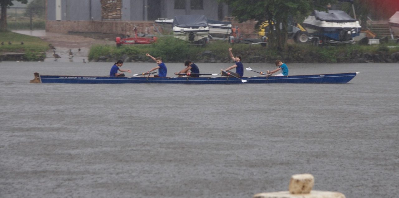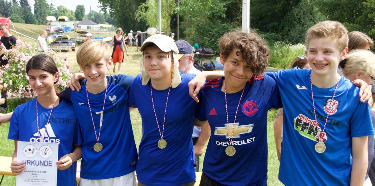Seit den Osterferien haben einige Schüler an dem Ruderprojekt des Schulruderzentrums Frankfurt teilgenommen und bis zu zwei mal die Woche trainiert. Trotz der kurzen Vorbereitung von ca. 2 Monaten hat es ein Mädchen-Vierer und ein Jungen-Vierer mit jeweils einer Steuerfrau geschafft, an dem Landesentscheid „Jugend trainiert für Olympia“ in Hanau für das Goethe-Gymnasium teilzunehmen. Der Mädchen-Vierer schied leider nach dem Vorlauf aus, der Jungen-Vierer konnte sich aber für den Zwischenlauf qualifizieren. Trotz starken Regens während des Zwischenlaufes konnten die Jungs mit ihrer Steuerfrau nach einer packenden Aufholjagd auf den zweiten Platz fahren und sich für das Finale qualifizieren. Im Finale lag unser Boot dann wieder zunächst stark zurück, aber die Jungs haben sich noch auf den 3.Rang gekämpft und bei ihrer ersten Regatta gleich Bronze geholt.