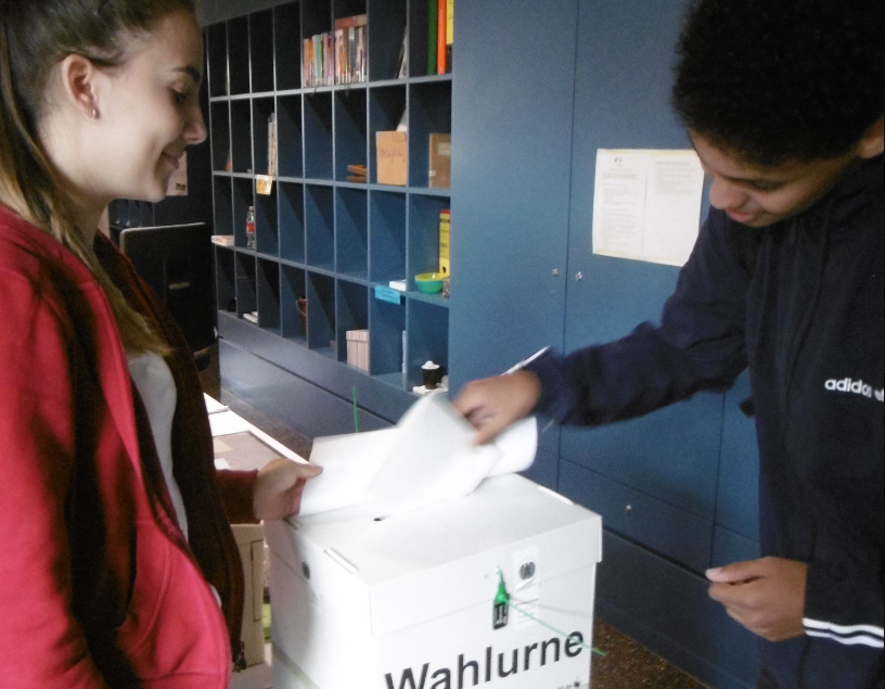 Die Materialien für die Wahlsimulation, Wahlbenachrichtigungen, Stimmzettel, sowie Wahlkabinen und –urnen lieferte das bundesweite Projekt Juniorwahl www.juniorwahl.de