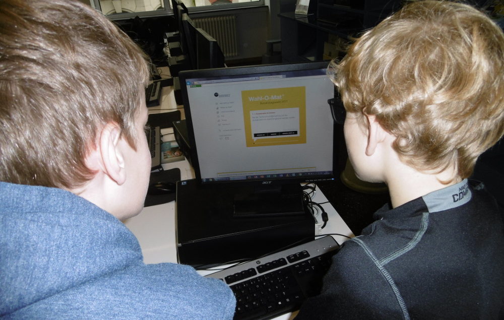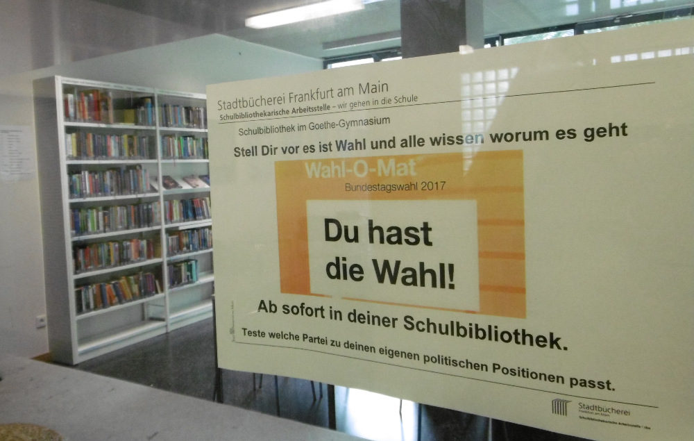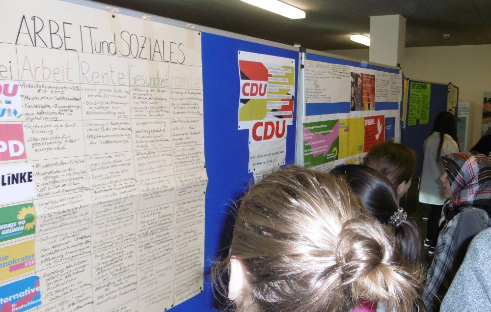 Der Fachbereich Politik und Wirtschaft (PoWi) und unsere Schulbibliothekarin entwickelten ein Projekt zur Aufbereitung der diesjährigen Bundestagswahl. Nach dem Motto Wissen aneignen – Meinung bilden – Kreuz machen, beschäftigten sich die PoWi-Kurse im Unterricht mit unterschiedlichen Hintergrundinformationen rund um das Thema Parteien und Wahlen und präsentierten die Ergebnisse auf Stellwänden der Schulgemeinde. In der Schulbibliothek konnte man sein Wissen mit der Befragung des Wahl-O-Mat der Bundeszentrale für politische Bildung abgleichen und auch die aktuelle WissensFrage in der Schulbibliothek widmete sich dem Thema Bundestagswahl.