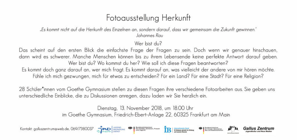 Impressionen der Fotoausstellung der Klasse 9b zu dem Thema „Herkunft“. Herzlichen Dank an das Gallus Zentrum und dem JMD des Internationalen Bundes.