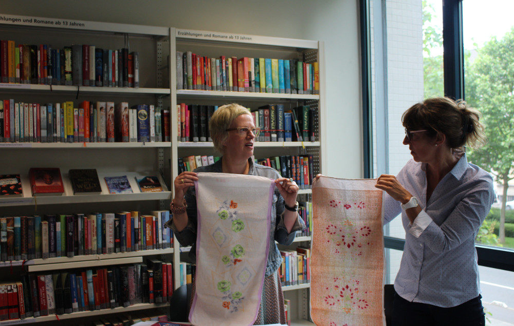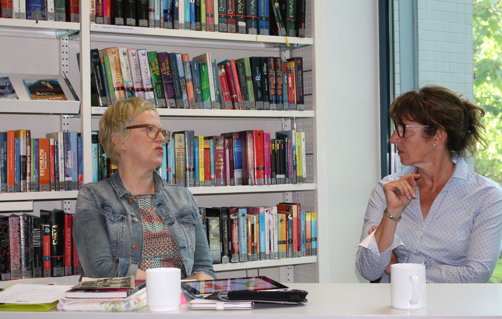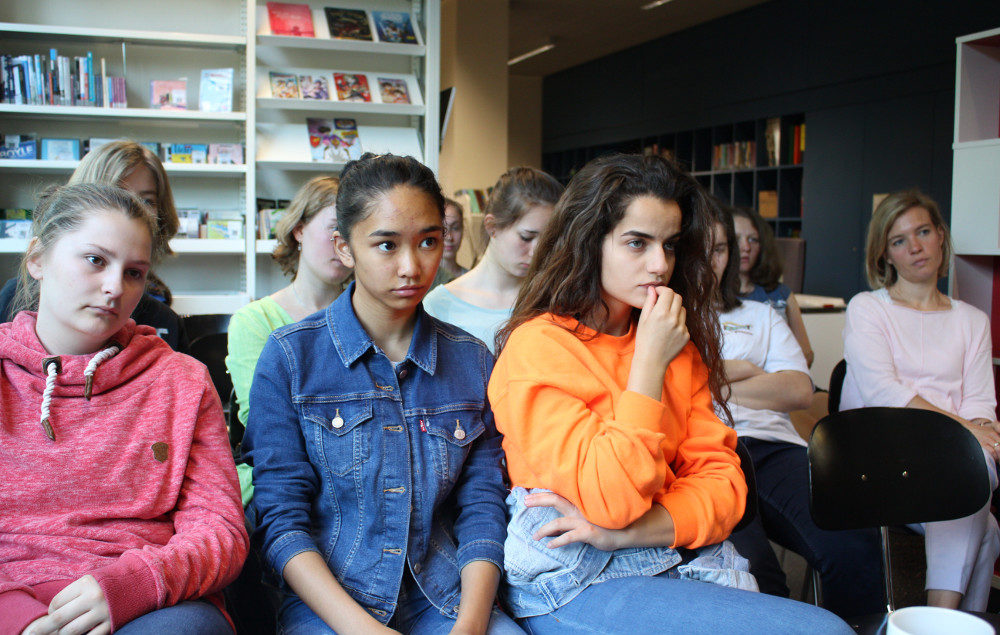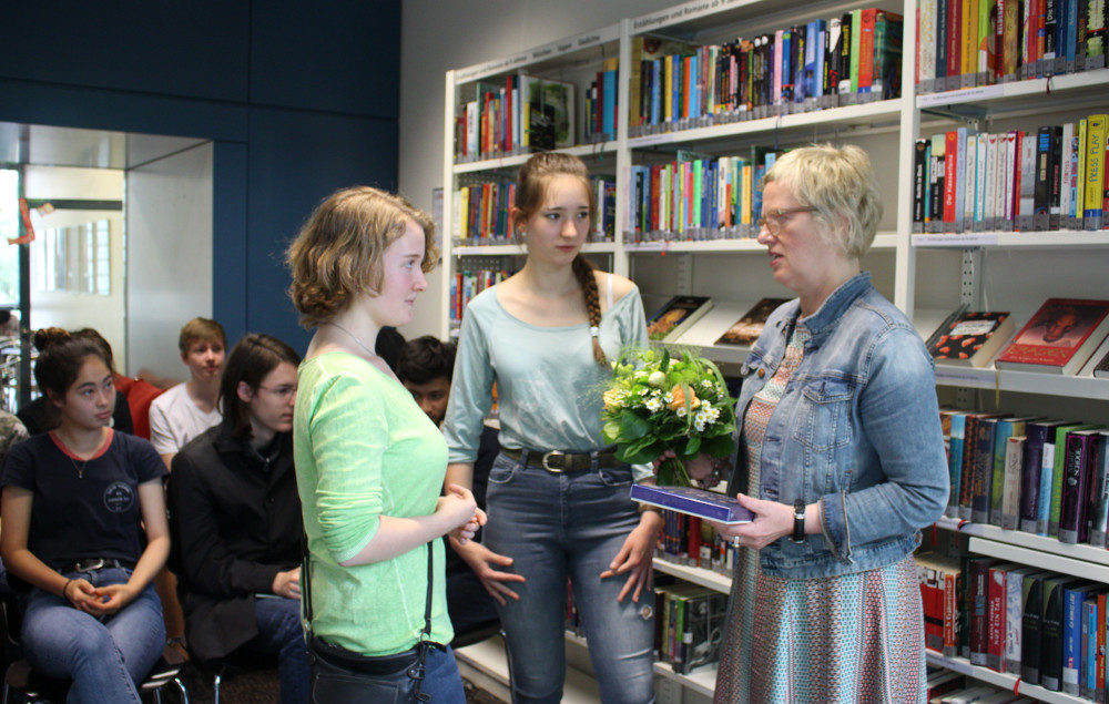 „Wer in der DDR Westkontakte durch Freunde oder Verwandte hatte, der hatte es gut, denn er bekam Westkaffee, Bananen und Westjeans“, berichtete Petra Rothe den Schülerinnen und Schülern der Klasse 9a bei einem Zeitzeugengespräch, das Frau Ahlrichs, gemeinsam mit der Geschichtslehrerin Frau Grossarth am 12. Juni 17 in der Schulbibliothek durchgeführt hat.