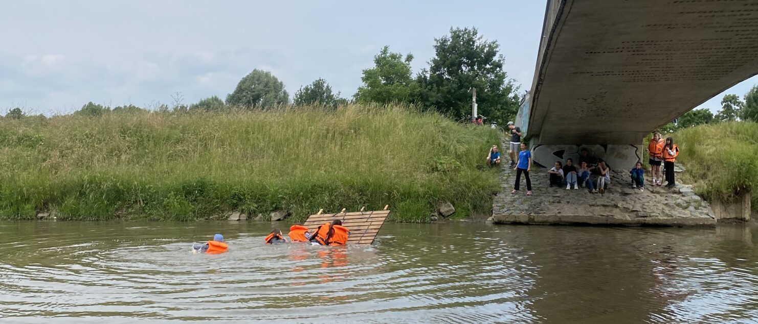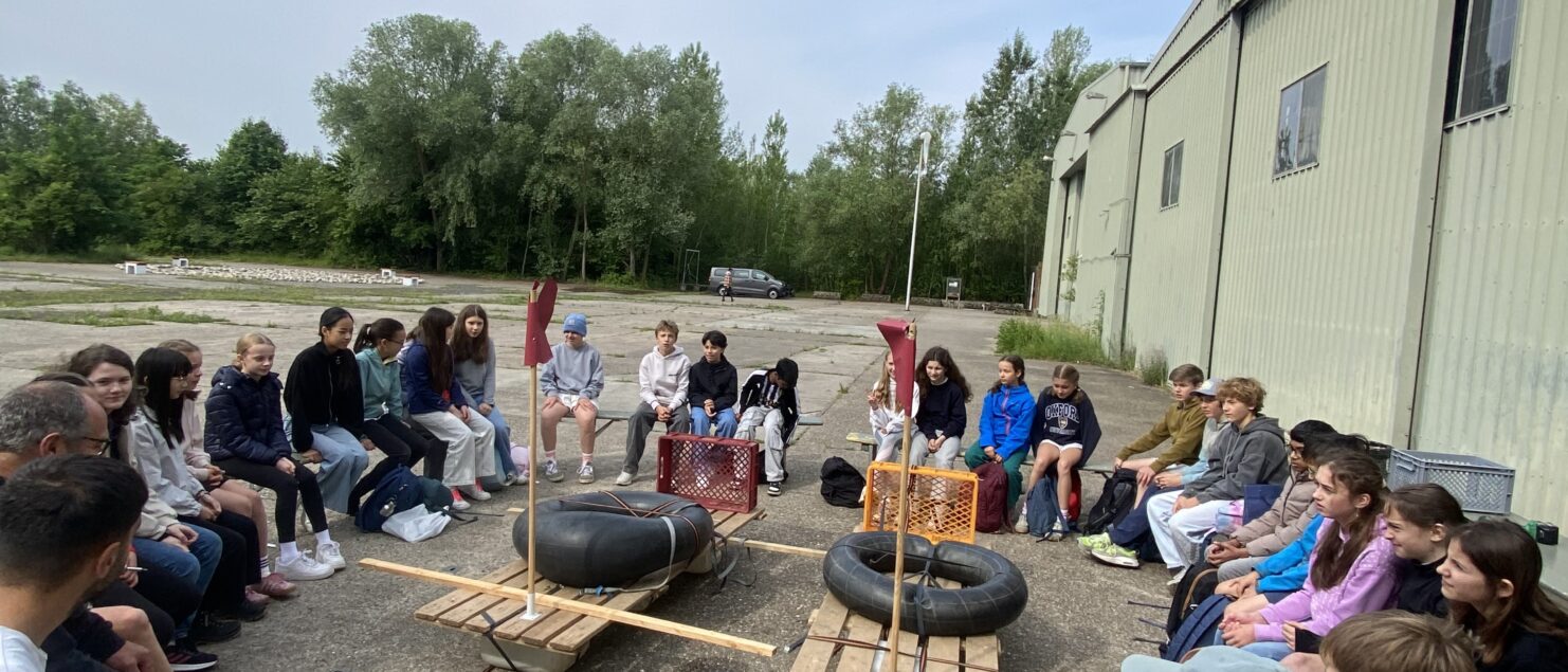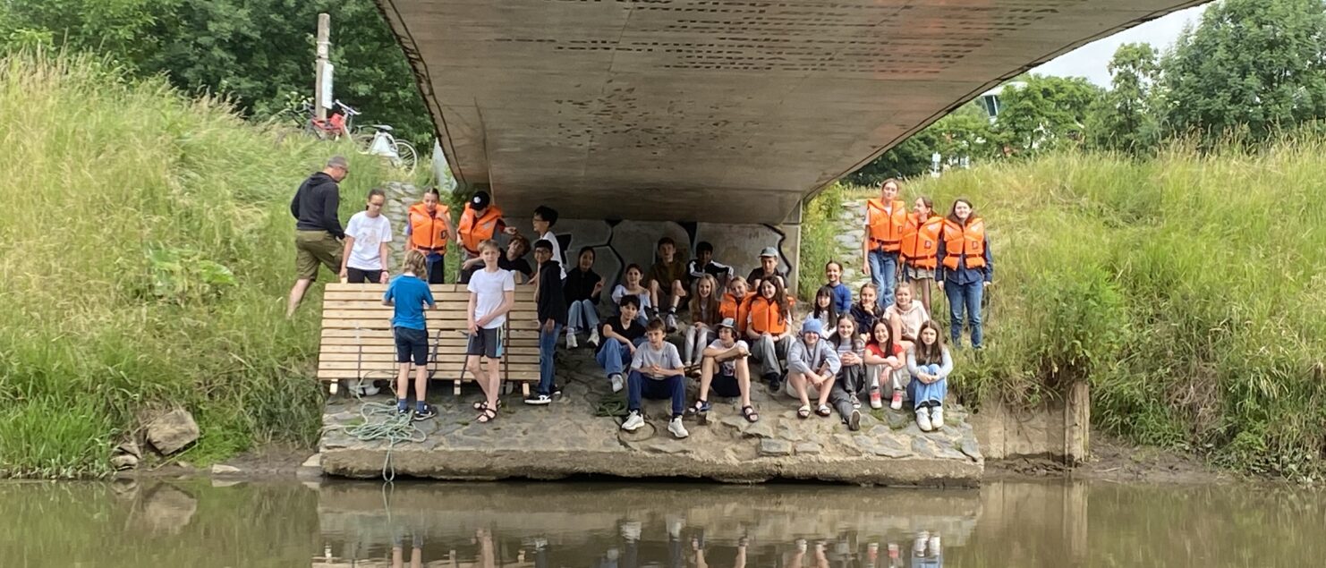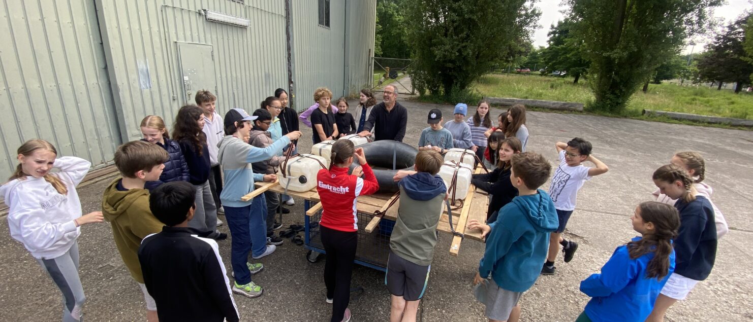 Der letzte Projekttag dieses Schuljahres führte uns zur Naturschule in Bonames. Der Leiter, Torsten und sein Assistent, Mahmed führten uns zu einer sehr großen Lagerhalle. Nach einer kurzen Einleitung und einem Briefing wurden wir in zwei Gruppen eingeteilt und bekamen die Aufgabe zwei Flöße zu bauen. Dafür hatten wir 20 Minuten Zeit. Da die Gruppen getrennt voneinander arbeiten mussten, und die Flöße identisch aussehen mussten, hatten wir sechs „Meetings“ a 90 Sekunden, zu denen immer die Teamleitungen erscheinen mussten, um Ideen auszutauschen und Bauschritte festzulegen. Die Zeit verging wie im Flug und die Flöße wurden von Torsten begutachtet, sie sahen fast identisch aus! Jetzt war es an der Zeit beide zusammenzuführen, sodass ein Floß entsteht, mit dem man die Nidda überqueren konnte. Am Ufer angekommen, überquerten wir in Gruppen den Fluss. Als einige die Idee hatten, zu fünft das Floß zu besteigen, gab es eine große Aufregung. Leider ist das Floß in Zeitlupe immer weiter ins Wasser gesunken, sodass alle fünf abgerutscht und ziemlich nass geworden sind. Die Mädels haben es aber gut aufgenommen und hatten zum Glück Wechselklamotten dabei.