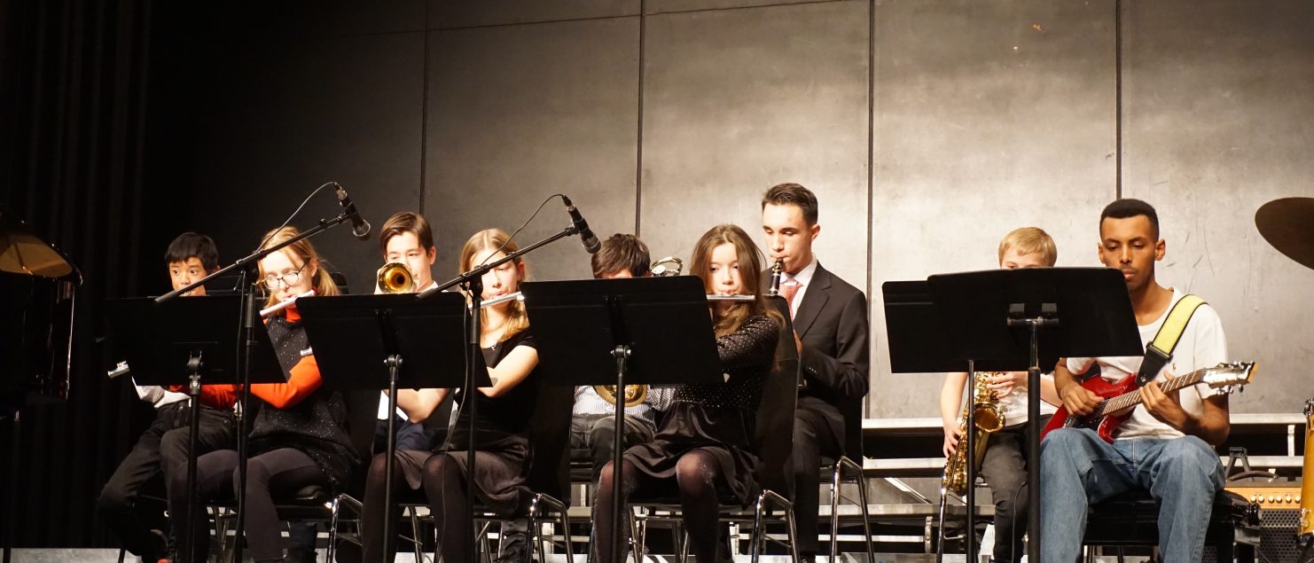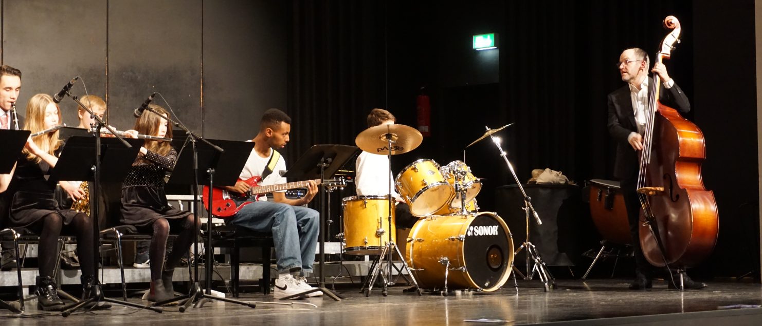 Mit der Band unter der Leitung von Herdan Dachroth wurde der Konzertabend mit Songs u.a. von Greenday eingeleitet: In der Aula herrschte sofort eine ausgelassene Stimmung, die von einigen Abiturienten, die eine eigene Band gegründet hatten, sofort aufgenommen und durch Taylor Swifts Song „Shake it off“ gesteigert wurde.