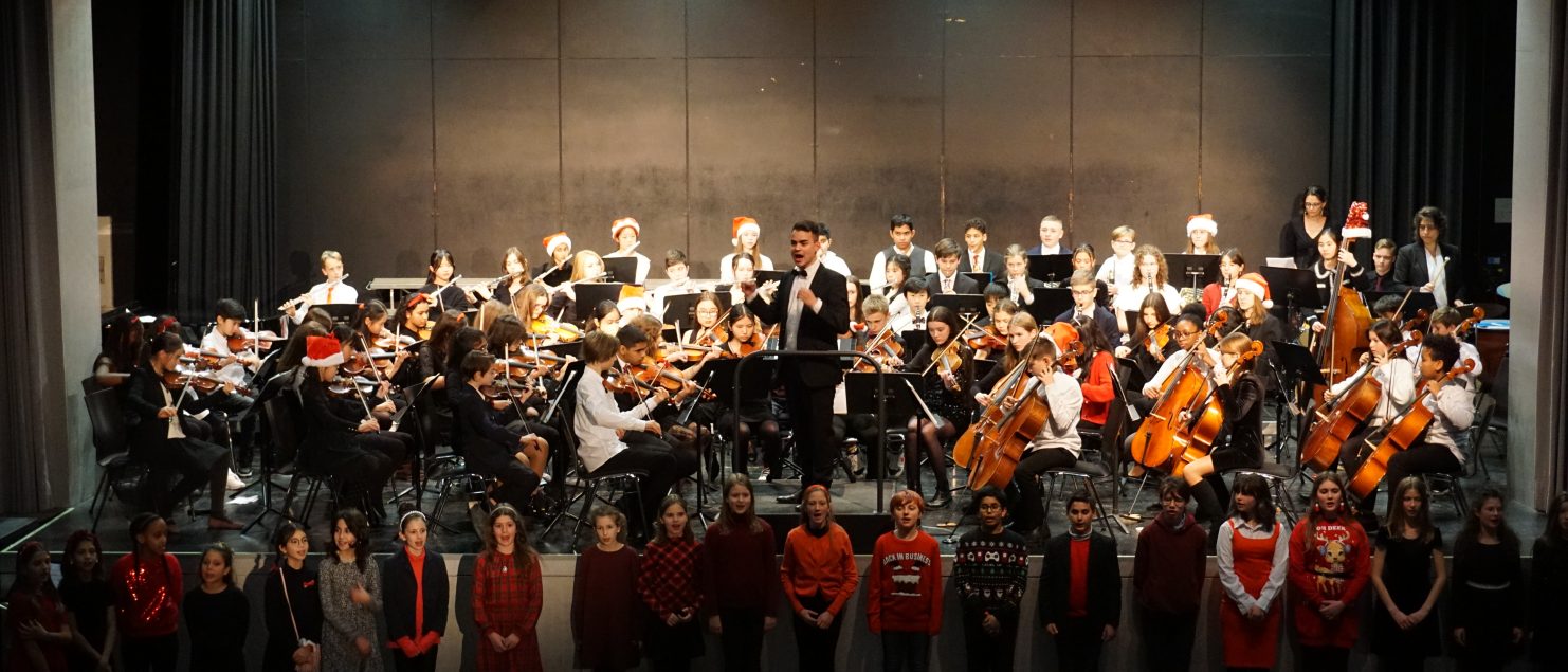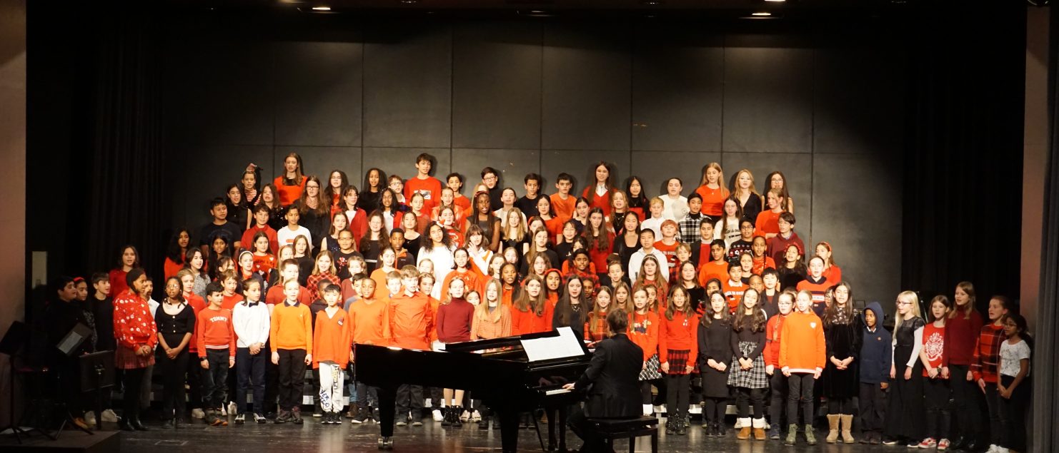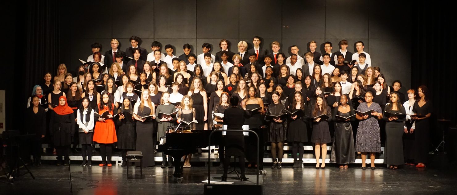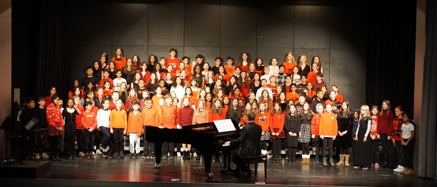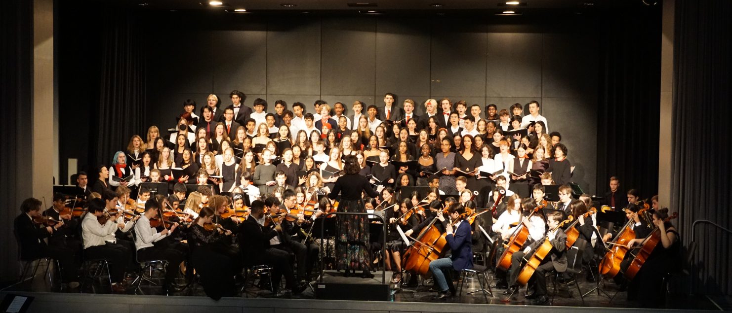 Denn in der zweiten Hälfte des Konzerts spielte zunächst das Junge Orchester unter der Leitung von Dr. Ute Utech und Dr. Felix Steiner den Weihnachtsklassiker „Santa Claus is coming to town“, als plötzlich der Chor erneut den Saal betrat und annähernd 250 Schülerinnen und Schüler gemeinsam „Adiemus“ von Karl Jenkins musizierten.