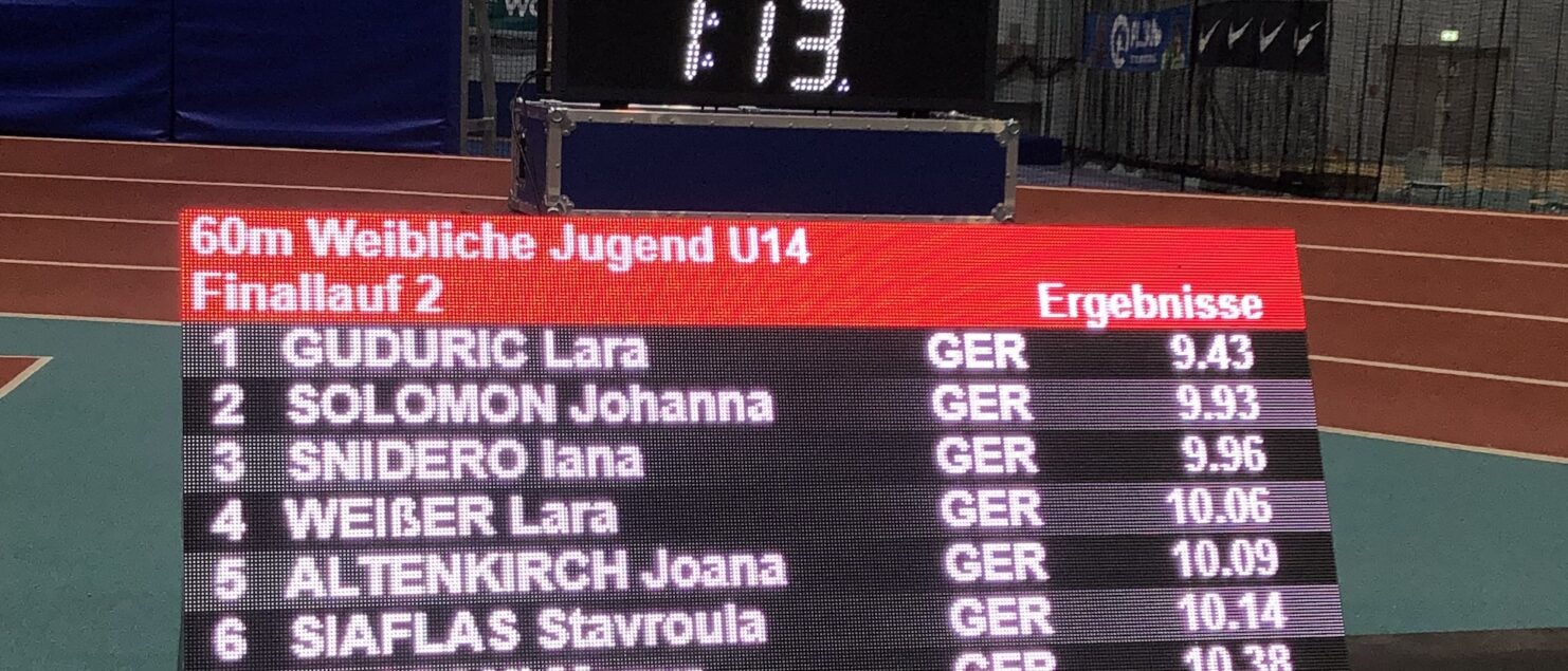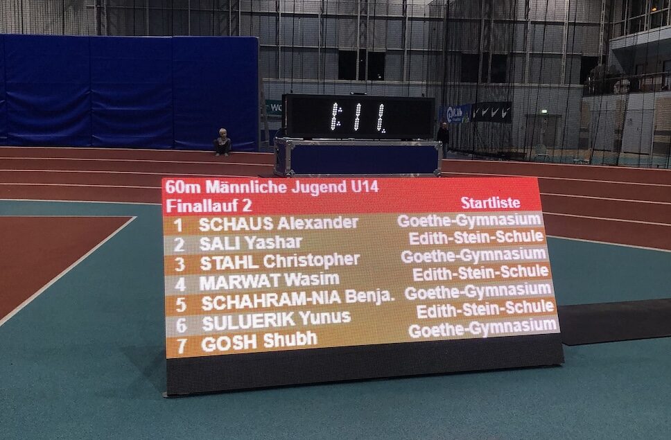Die Finalrunde wurde im Rahmen der deutschen Mehrkampfhallenmeisterschaften der Leichtathletik ausgetragen, und die Kinder des Goethe-Gymnasiums hatten die besondere Gelegenheit, diese Meisterschaften im Anschluss zu besuchen. Hier war auch Zehnkämpfer Niklas Kaul anwesend, Gewinner der Goldmedaille bei den Weltmeisterschaften 2019 in Doha sowie bei den Europameisterschaften 2022 in München. Um sich für die Finalrunde zu qualifizieren, traten im Vorfeld im November insgesamt 400 Kinder der 6. Klasse von fünf Schulen unter den wachsamen Augen von Luban Haque, deutscher U20-Hallenmeister 2023 (200 m und 4x200m), in ihren Schulen an, um 30 Meter durch eine Lichtschranke zu sprinten. Die besten 30 qualifizierten sich für die Finalrunde, die in der Leichtathletikhalle in Kalbach ausgetragen wurde. Unterstützt wurden unsere Sprinterinnen und Sprinter von unseren Sportlehrern Andreas Schalomon und Alexander Klooz.
