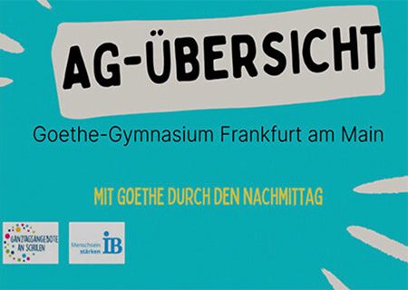 Die AGs werden teilweise von unserem Partner für das Nachmittagsangebot, dem Internationalen Bund (IB), teilweise vom Goethe-Gymnasium ausgerichtet. Wer für die Ausrichtung verantwortlich ist, ändert jedoch für Sie nichts: Alle AGs finden Ihre Abbildung in einem gemeinsamen Plan und einer gemeinsamen Info-Broschüre, die Sie auch im Download-Bereich auf unserer Homepage finden. Das Nachmittagsprogramm am Goethe-Gymnasium ist reichhaltig und vielfältig – natürlich wird in den einzelnen AGs die Anwesenheit der Teilnehmenden kontrolliert, eine Betreuung und Aufsicht ist somit garantiert.