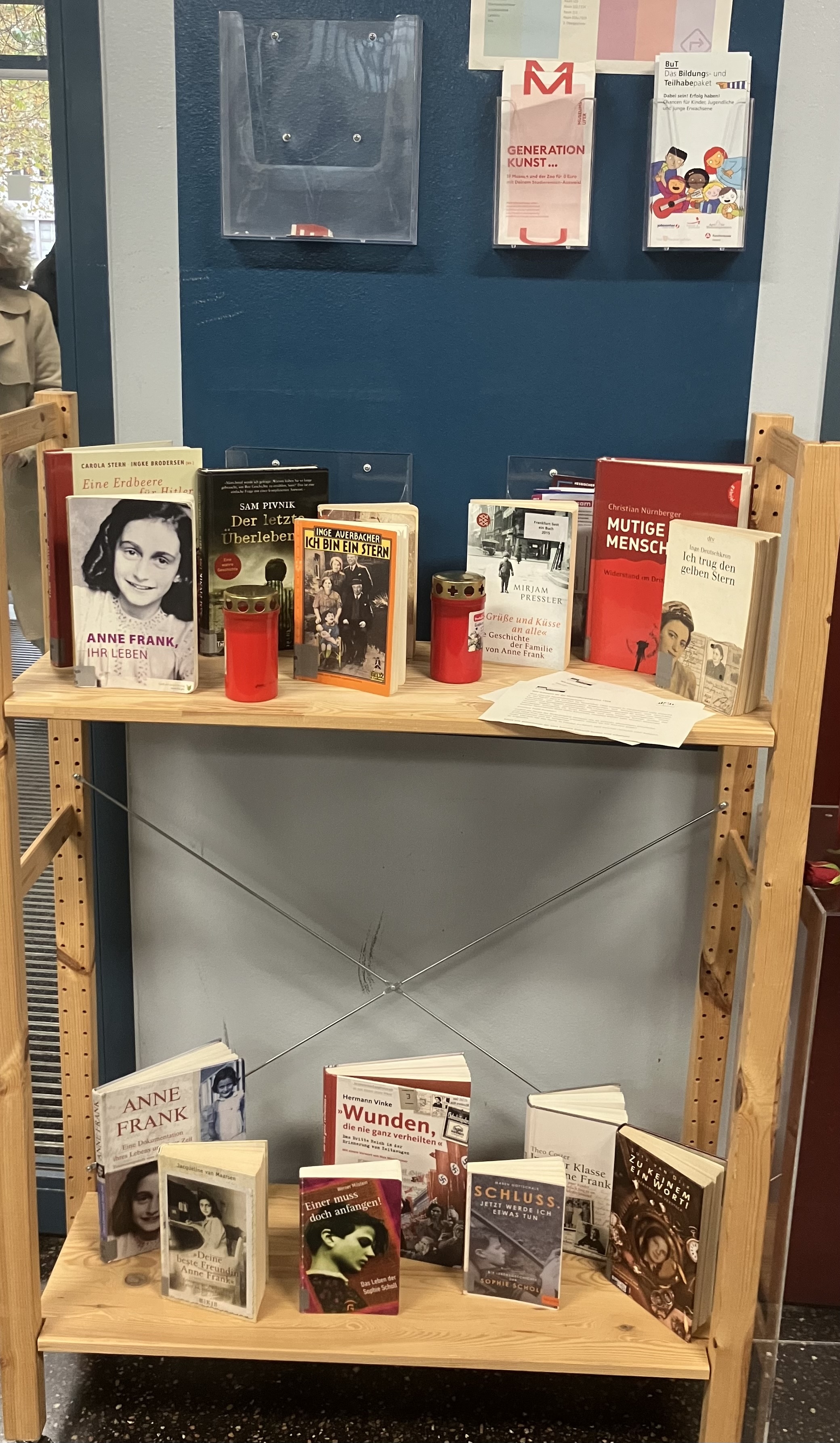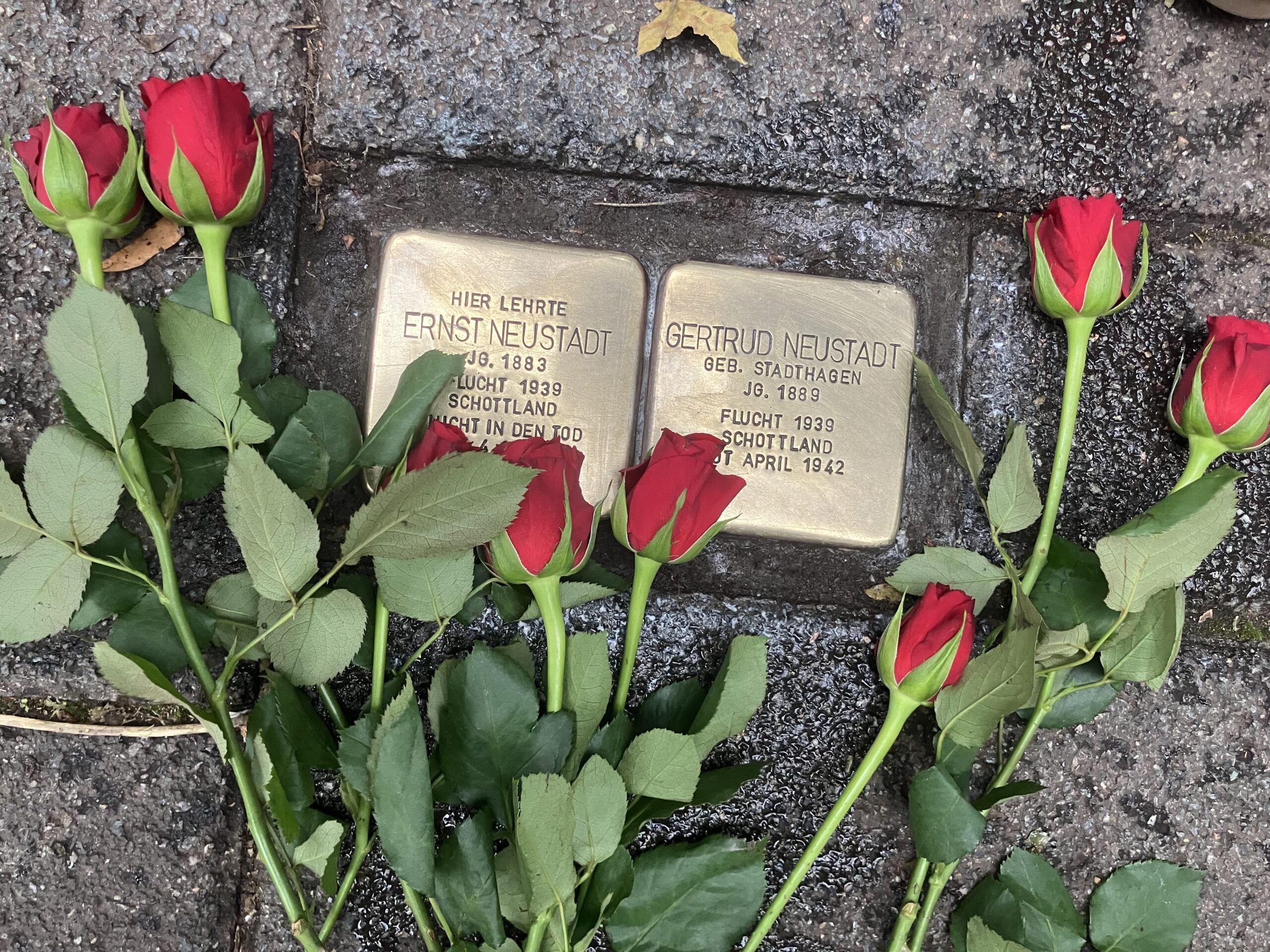 Um an dieses Ereignis zu erinnern, hat die AG „Schule mit Courage“ die Lernenden in der großen Pause mit Flyern und einem Bücherstand der Schulbibliothek über das Novemberpogrom informiert. Eine Klasse hat die Stolpersteine für Frau und Herrn Dr. Neustadt gereinigt. Engagierte Lernende haben nach der achten Stunde rote Kerzen neben die vielen Stolpersteine rund um die Schule gelegt, um auch außerhalb der Schulgemeinde an das Geschehene zu erinnern. Hierdurch wollen wir ein Zeichen gegen Antisemitismus und für Solidarität setzen.