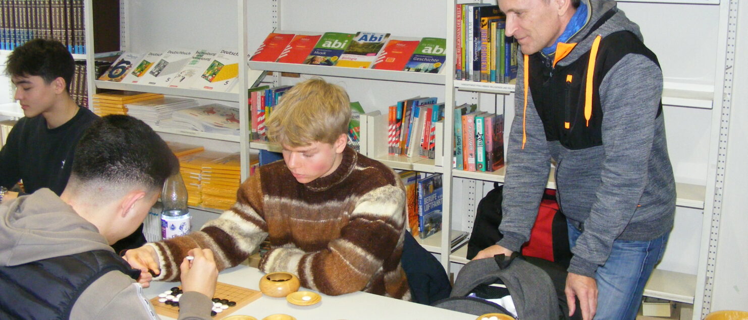 Für den Bestand der Schülerbibliothek hatte Herr Dickfeld als Geschenk einige Go-Sets mitgebracht, so dass man von nun an in den Pausen und Freistunden neben dem Schachspiel auch die Möglichkeit zum Spielen einer Partie Go hat. Herzlichen Dank an Herrn Dickfeld für seinen Besuch und die Spende; der Japanischkurs war mit Eifer bei dieser Go-Stunde dabei.