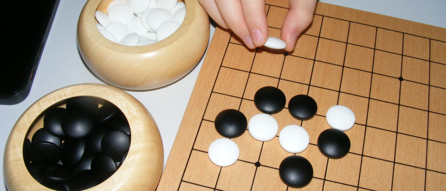 Es folgte dann Partie auf Partie, und nacheinander wurden weitere Regelfeinheiten erläutert, so dass alle gut mitziehen konnten. Wie im Schach gibt es schwarze und weiße Spielsteine, und man kann auch gegnerische Spielsteine schlagen, aber anders als im Schach beginnt Schwarz mit dem ersten Zug, die Steine sind alle gleich, und man ist frei dabei mit der Auswahl, wohin man die Steine setzen will. Die Bewegung der Spielfiguren, die so zentral für das Schachspiel ist, spielt im Go keine Rolle: Einmal gesetzt, bleiben sie an Ort und Stelle.