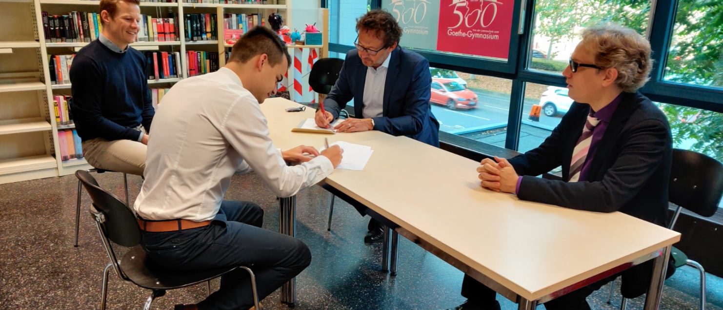 Am 22. September 2020 besuchte der Vizepräsident der HfMDK Prof. Axel Gremmelspacher unsere Schule, um die unterschriebene Kooperationsvereinbarung abzuholen. (Si)