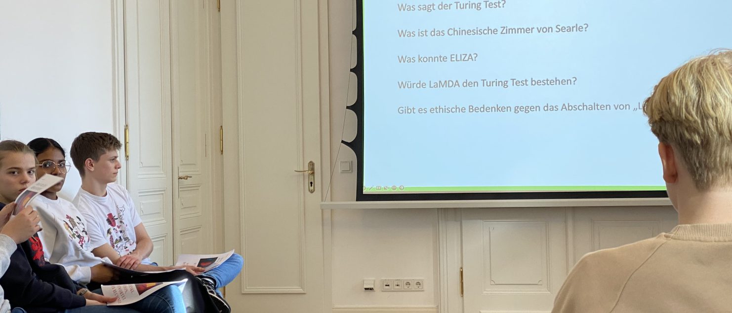 Am Ende des Unterrichts hatten wir eine interessante Diskussion im Plenum über verschiedene Fragen zur künstlichen Intelligenz und ihrer zukünftigen Entwicklung. Wir diskutierten Fragen wie: „Werden Maschinen irgendwann intelligenter als Menschen sein?“, „Können sie ein Bewusstsein entwickeln?“ und „Werden wir in der Lage sein, zwischen einer echten Person und einem Chat GPT zu unterscheiden?“. Es war eine informative Diskussion, die uns dazu anregte, tiefer in das Thema einzutauchen und uns Gedanken über die Auswirkungen der künstlichen Intelligenz auf unsere Zukunft zu machen. Insgesamt war es ein sehr lehrreicher Tag und ich freue mich auf mehr solche Tage im Goethe-Kolleg für junge Talente.
