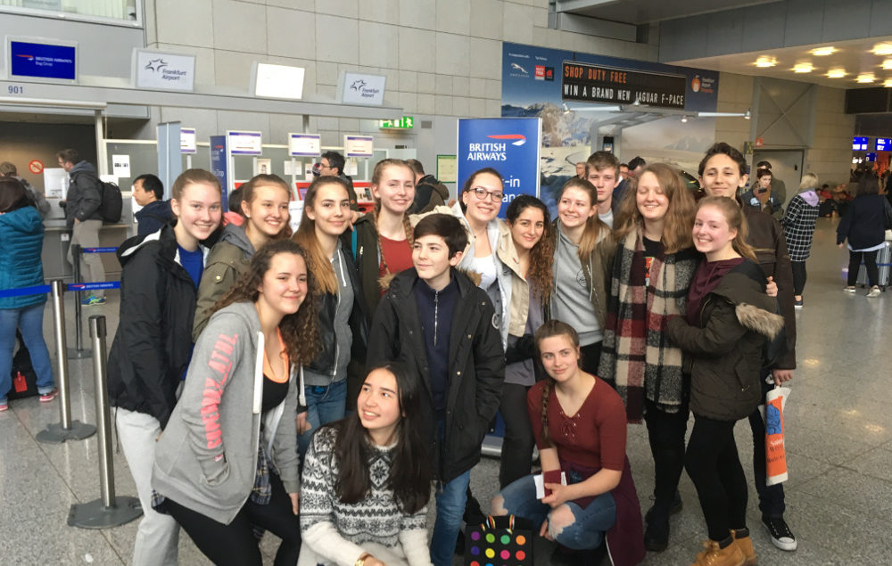 Der Gegenbesuch der englischen Schüler fand im darauffolgenden Jahr statt, am 22. Januar 2017 wurden sie zusammen mit dem Schulleiter, Mr. Barrs, am Flughafen freudig begrüßt. Für den Gegenbesuch kamen neun Schüler und Schülerinnen nach Frankfurt, Helena Rink (9b) nahm freundlicherweise eine Partnerin auf. Mr. Barrs überreichte Frau Dröser-Dittmann ein besonderes Gastgeschenk, das an die seit 40 Jahren andauernde Partnerschaft zwischen unseren Schulen erinnerte. Auch die englischen Schüler mussten sich den Herausforderungen des Schulalltags am Goethe-Gymnasium stellen und das Großstadtleben meistern bzw. genießen. In der Schule stand ihnen dabei – neben allen beteiligten Schülern und Lehrern der Jahrgangsstufe 9 – auch Frau Leventopoulou hilfreich zur Seite, die den Gästen zusätzlichen Deutschunterricht erteilte. Die englischen Gäste besuchten zusammen mit Frau Thomas außerdem das Filmmuseum am Frankfurter Museumsufer und nahmen an einem Filmworkshop teil. Ebenfalls auf dem Programm stand ein Ausflug ins Goethe-Haus.