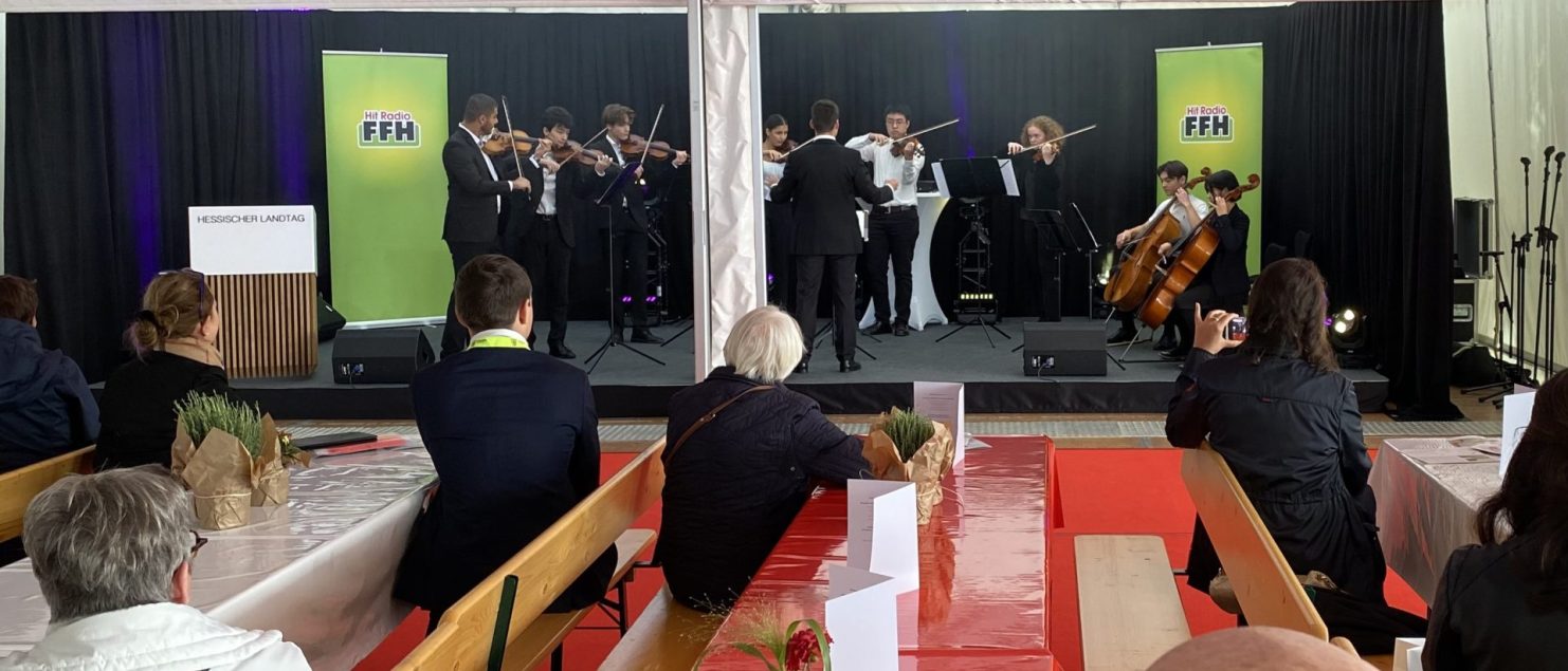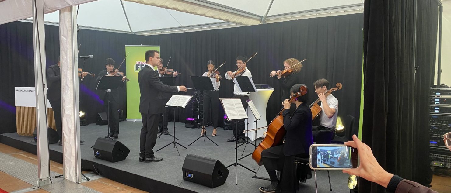Direkt nach der Probenphase in der Landesmusikakademie Schlitz trat das Kammerorchester unter der Leitung von Dr. Felix Steiner im Hessischen Landtag am 24.09.2022 auf. Beim Tag der offenen Tür des Landtags präsentierte das Ensemble auf der FFH-Bühne in neuer Besetzung Werke von W. A. Mozart, V. Monti und Coldplay.