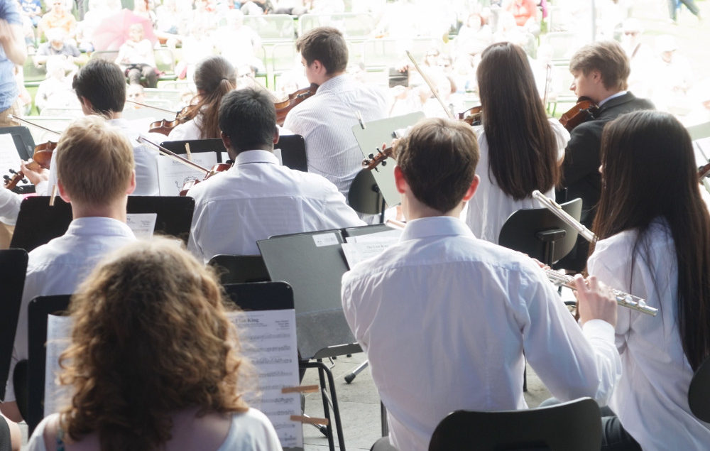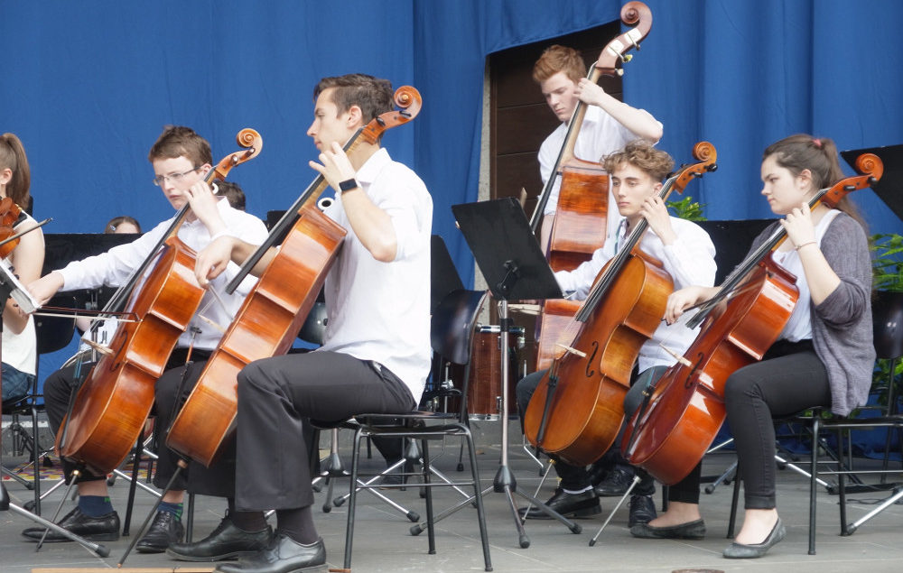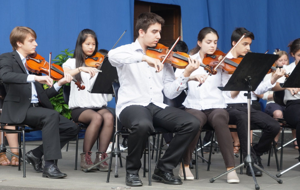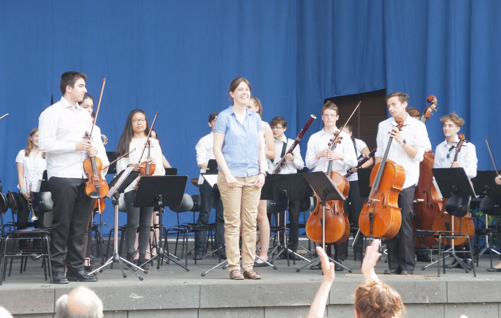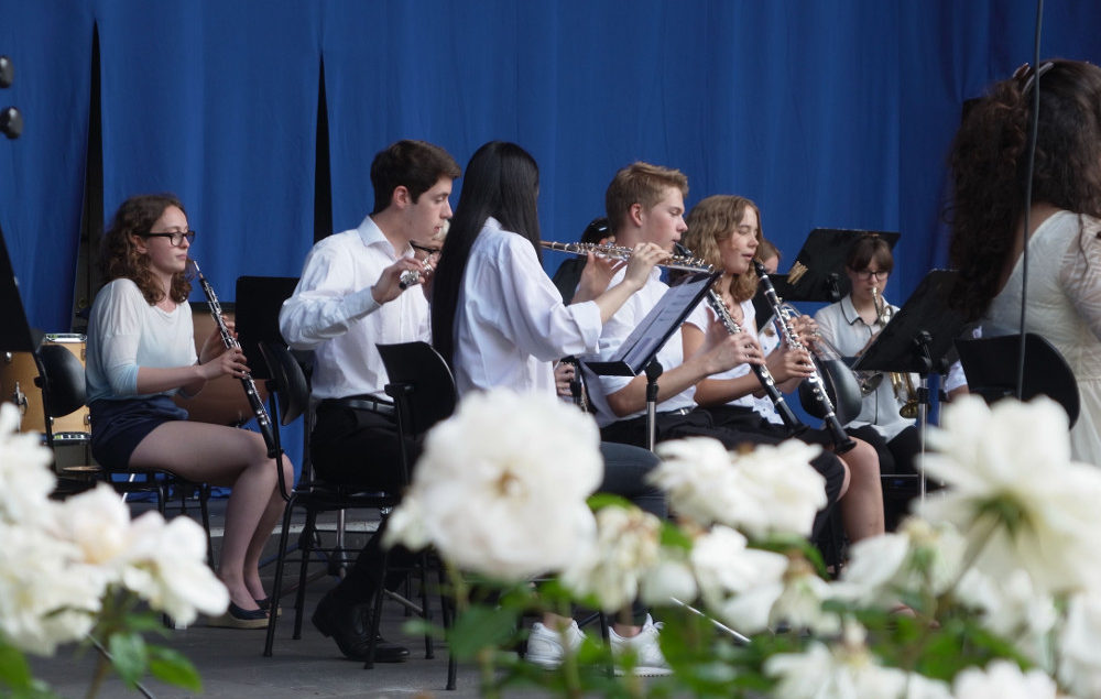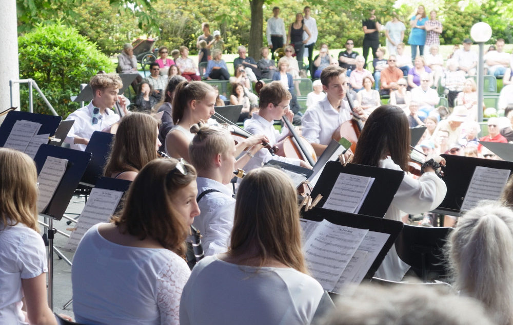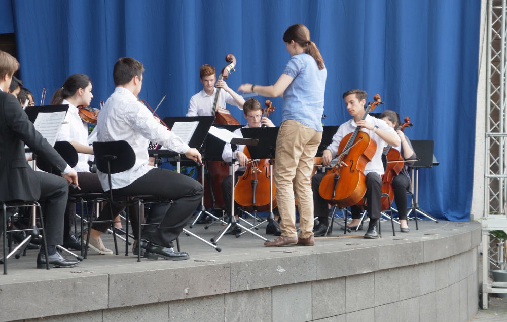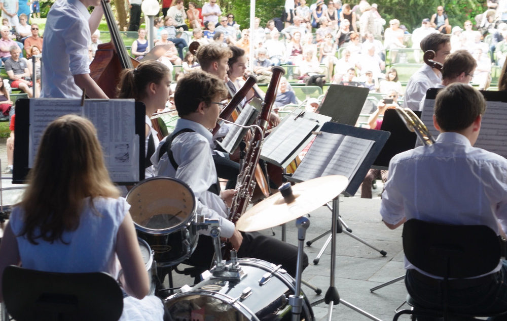 Einen hervorragenden Eindruck hinterließ das Orchester unter der Leitung von Tabea Fuhr beim zweiten Konzert der Frankfurter Schulen mit Schwerpunkt Musik in der Konzertmuschel des Palmengartens (Sonntag, 28.6.). Neben unseren Schülerinnen und Schülern traten Instrumentalensembles der Bettinaschule, der Elisabethenschule, der Leibnizschule Höchst, der Schule am Ried, der Wöhlerschule bei diesem hochsommerlichen Konzert im wohl schönsten Freiluftareal der Stadt auf. Das sehr zahlreiche Publikum belohnte die Leistungen aller mit großem Applaus. Unser Orchester spielte ein Medley aus „Der König der Löwen“ sowie den Ungarischen Tanz Nr. 5 von Johannes Brahms zum Abschluss der Individualauftritte.