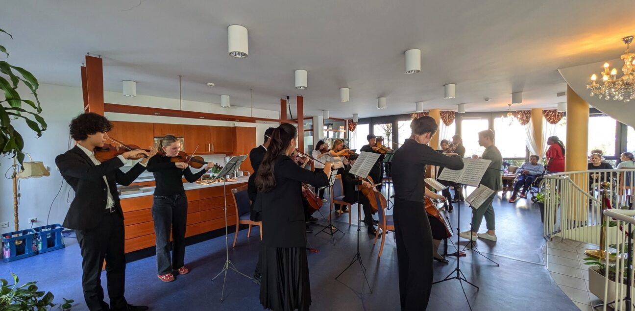 Im Rahmen des International Baccalaureate Diplomas organisierte Melis Yilmaz (Q2) im Rahmen des CAS-Projektes mit hochkarätigen Beiträgen von Musizierenden und Jugend-Musiziert-Preisträgern als auch dem Kammerorchester des Goethe-Gymnasiums ein klassisches Konzert für die Bewohnerinnen und Bewohner des Victor-Gollancz-Hauses in Frankfurt Sossenheim. Mit viel Herz und Leidenschaft musizierten unsere Schülerinnen und Schülern und sorgten so für einen abwechslungsreichen Nachmittag im Pflegeheim. (stf)