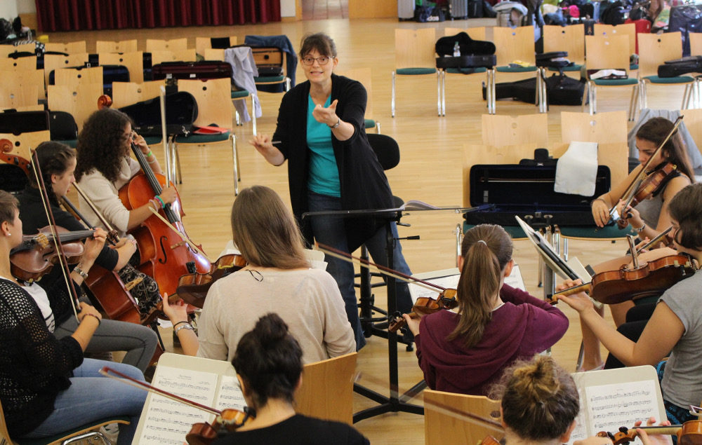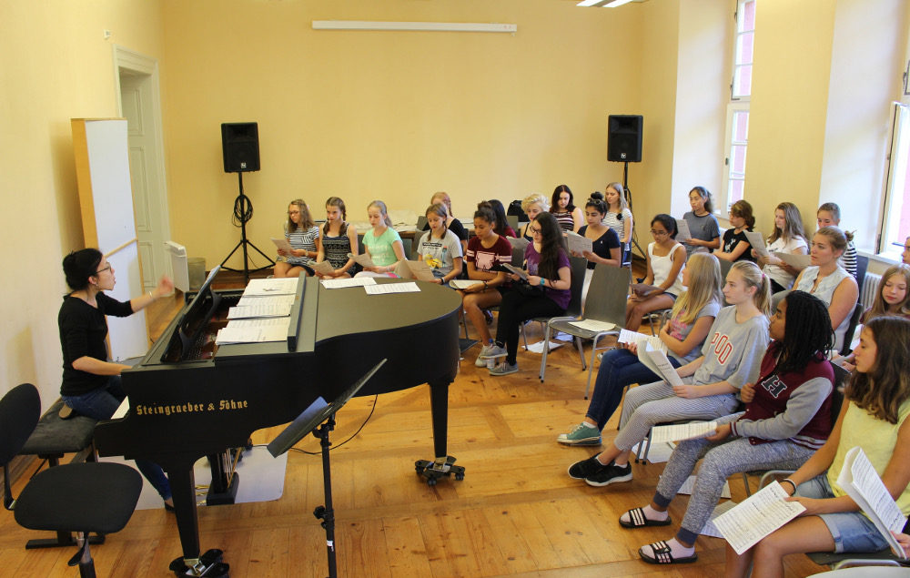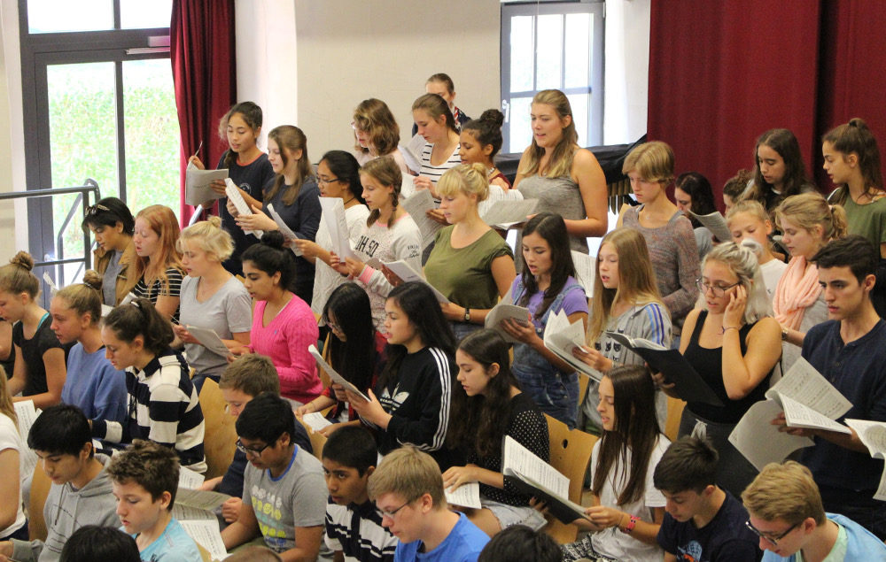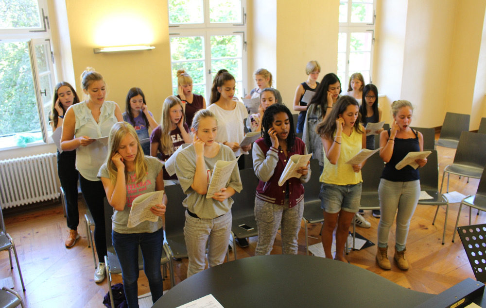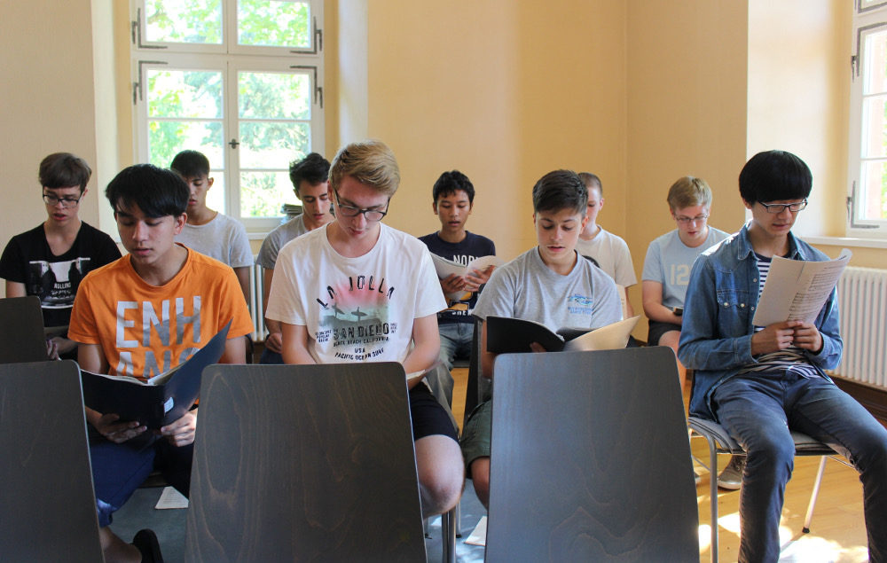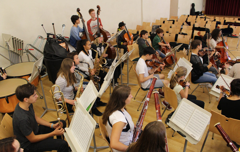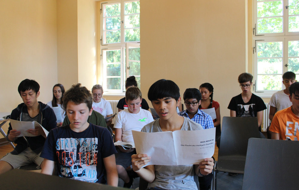 Drei Probentage verbrachten Chor (Frau Rinderknecht, Herr Kaballo) und Orchester (Frau Schagen, Herr Dr. Steiner) mit insgesamt 102 Schülerinnen und Schüler in der hessischen Landesmusikakademie in Schlitz. Idyllisch im weitläufigen englischen Landschaftsgarten gelegen, bietet Schloss Hallenburg ideale Proben- und Freizeitbedingungen fernab des Alltagstrubels. Im Mittelpunkt stand, neben anderen Werken, das Opus 20 von Max Bruch „Die Flucht der heiligen Familie“. Das einsätzige Werk für bis zu achtstimmigen Chor und großes Orchester, im ochromantischen