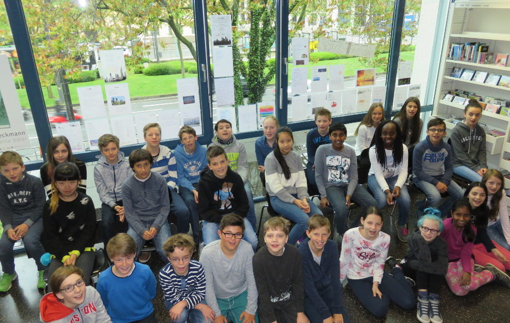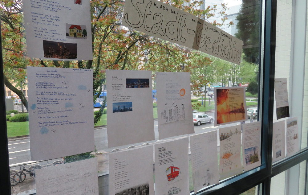 Im Deutschunterricht und während der Osterferien verfassen die Schüler und Schülerinnen eigene Gedichte zum Thema Stadt. Aufwendig illustriert sind sie in der Schulbibliothek ausgestellt, mit Spannung werden sie von der Schulgemeinde erforscht.