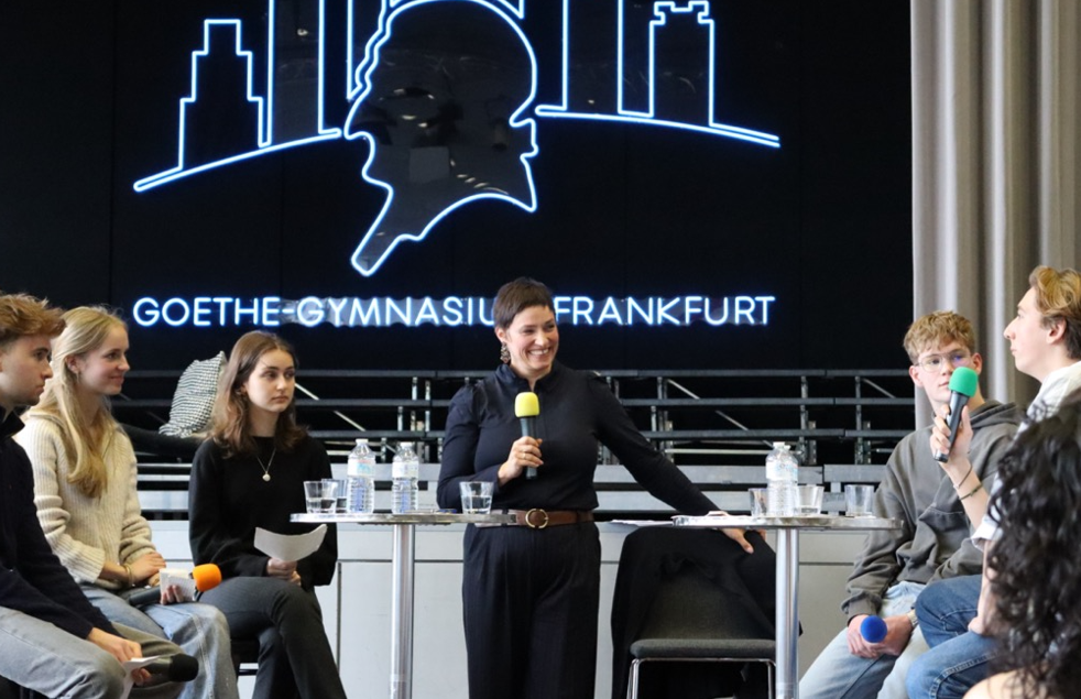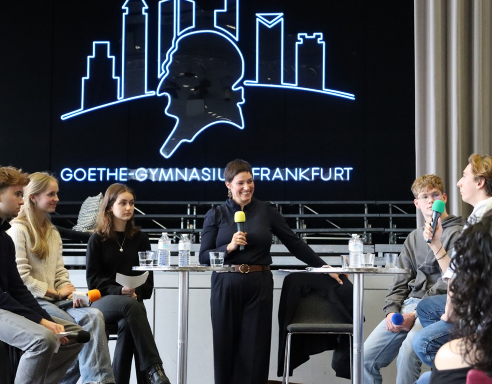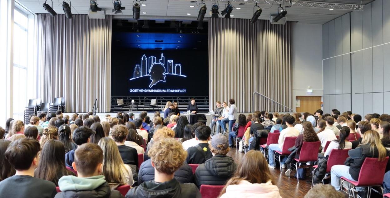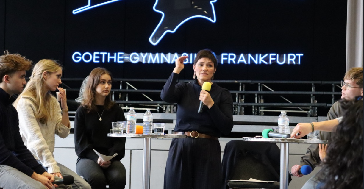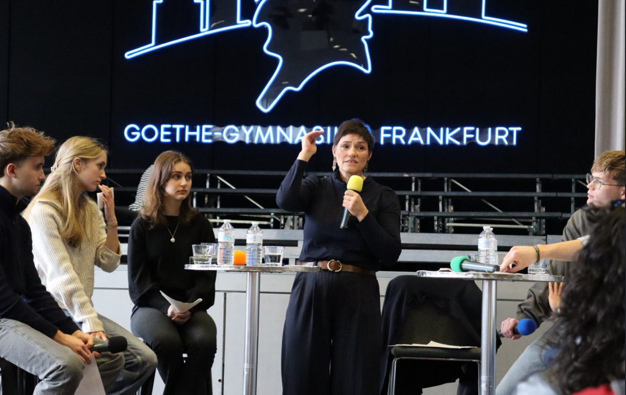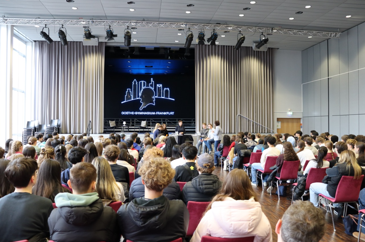 Am 24.02.2026 kam sie in die Aula des Goethe-Gymnasiums und stellte sich auf dem Podium den Fragen, die die Schülerinnen und Schüler aus der Q2 (v.l.: Thaddeus Schahram-Nia, Zalira Bispinck, Helena Akymovich, Leo Radermacher, Philipp Hegner) teilweise zuvor vorbereitet hatten, teilweise spontan in der Veranstaltung formulierten. Frau Prof. Deitelhoff erklärte geduldig und aufmerksam. Ihr Appell an die junge Hörerschaft: Wenn man den Wandel, der in der Gesellschaft zu beobachten sei, nicht aktiv vollziehe, stelle er sich irgendwann von selbst ein – ohne, dass man ihn gestalten könne. Besser sei es, sich den Herausforderungen zu stellen und mitzumachen, politisch aktiv zu werden. Die Fragen der Schülerinnen und Schüler betrafen die gesamte Weltlage – ausgehend von Deutschland und der Frage um die Wehrpflicht, über den Krieg in der Ukraine und das Verhältnis von Europa zu Trump. Die Diskussionsrunde war intensiv und hochinteressant. Man merkte: Wenn hier jemand das Lagerfeuer der Gesellschaft am Leben hält, dann sind es Menschen wie Frau Prof. Deitelhoff – indem sie nicht müde wird, sich auf Nachfrage und Erklärung einzulassen. Den Dialog braucht es. Dann klappt es auch mit dem Lagerfeuer. Vielen Dank für diese spannende Veranstaltung! Wir haben noch lange weiterdiskutiert!