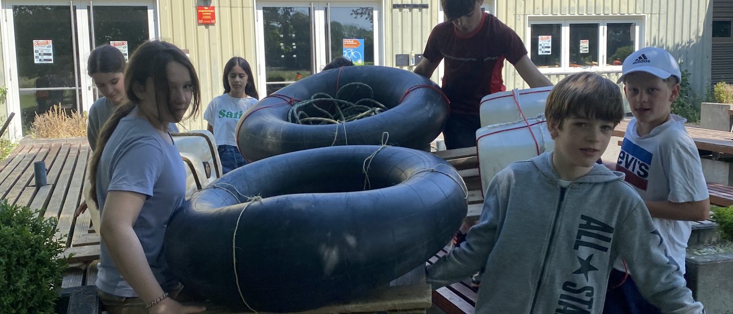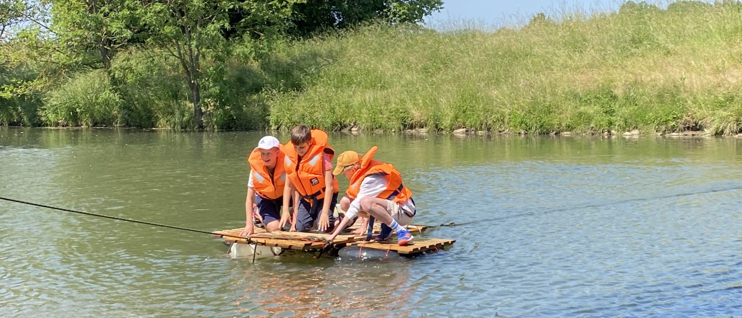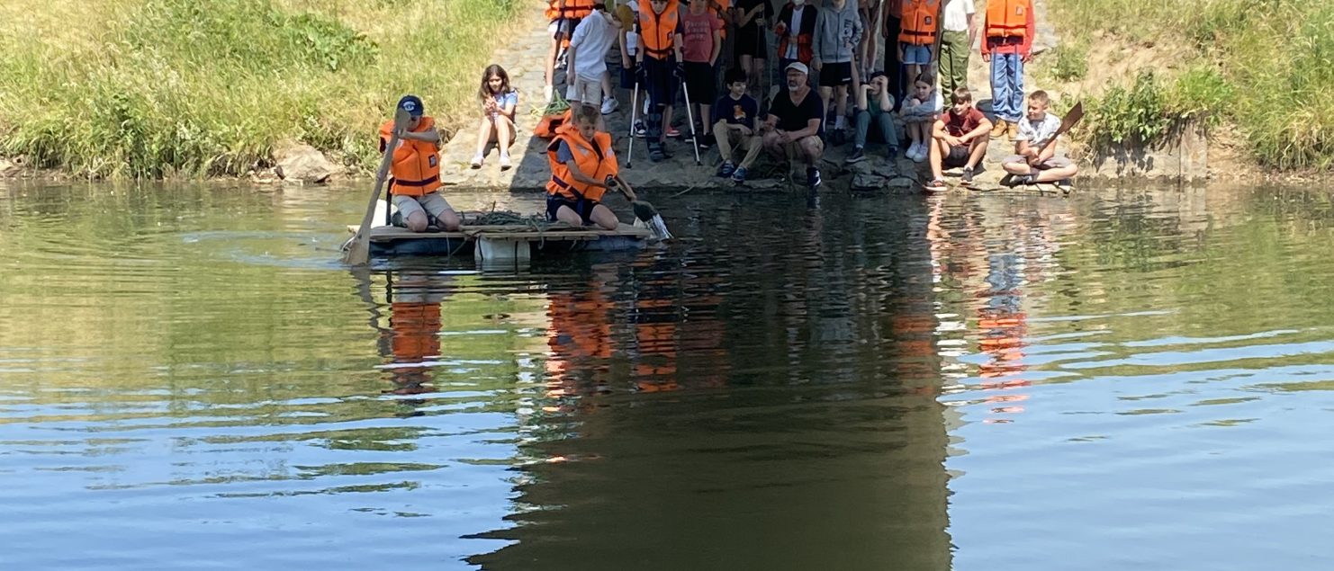 Danach folgte das Highlight des Tages: Mit einem Floß über die Nidda fahren. Wir wurden in drei Gruppen eingeteilt und jede Gruppe hatte eine Aufgabe.