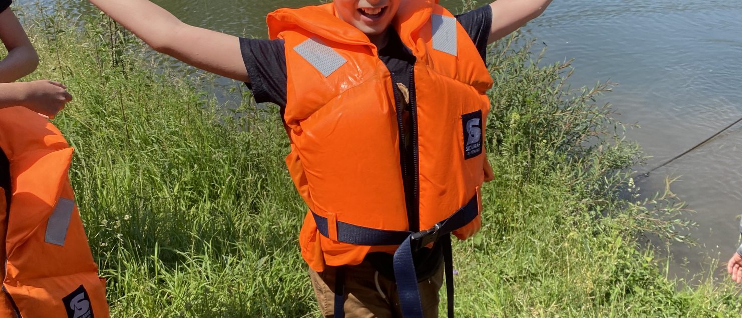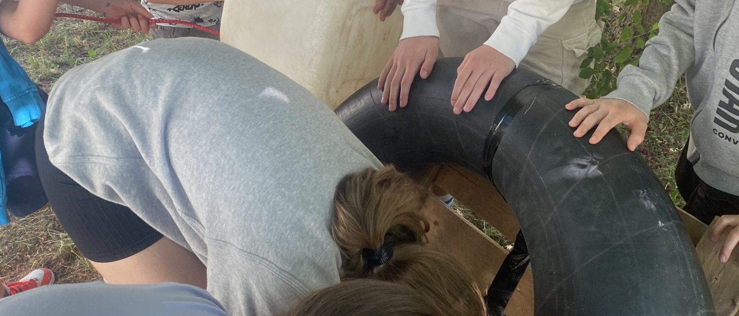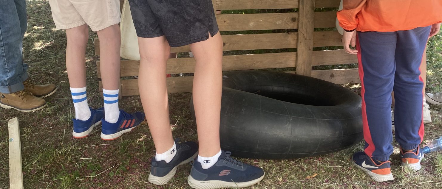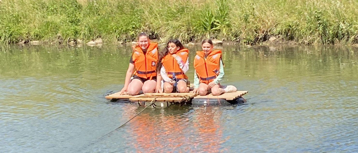 Meine Gruppe überlegte sich, wie wir mit dem Floß von der einen Seite auf die andere Seite kommen könnten. Nach der Teambesprechung gingen wir alle zur Nidda und ließen das Floß ins Wasser. Durch eine geschickte Taktik mit zwei Seilen konnten dann alle nach und nach in Zweier- und Dreier-Gruppen trocken ans andere Ufer kommen. Außer einem Schüler, der leider ins Wasser fiel, aber durch die Schwimmweste schnell wieder am Ufer war. Er nahm es mit Humor und wir hatten alle viel Spaß.