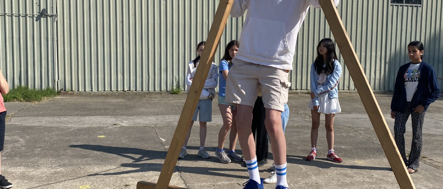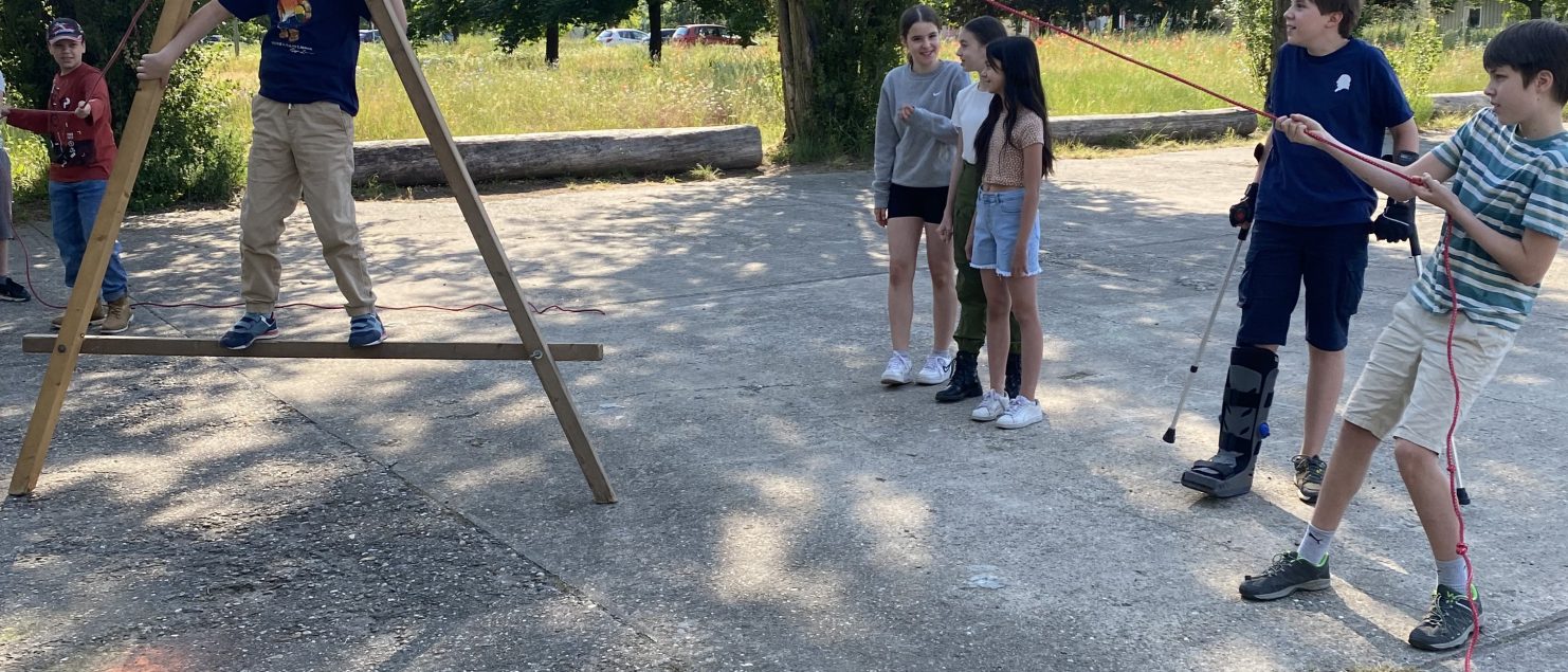 In der ersten Übung ging es vor allem um Teamarbeit, aber auch Konzentration war gefragt. Wir mussten geschickt mit vier Seilen ein etwa 2,5 Meter großes „A“ aus Holz fortbewegen, ohne es zu berühren.