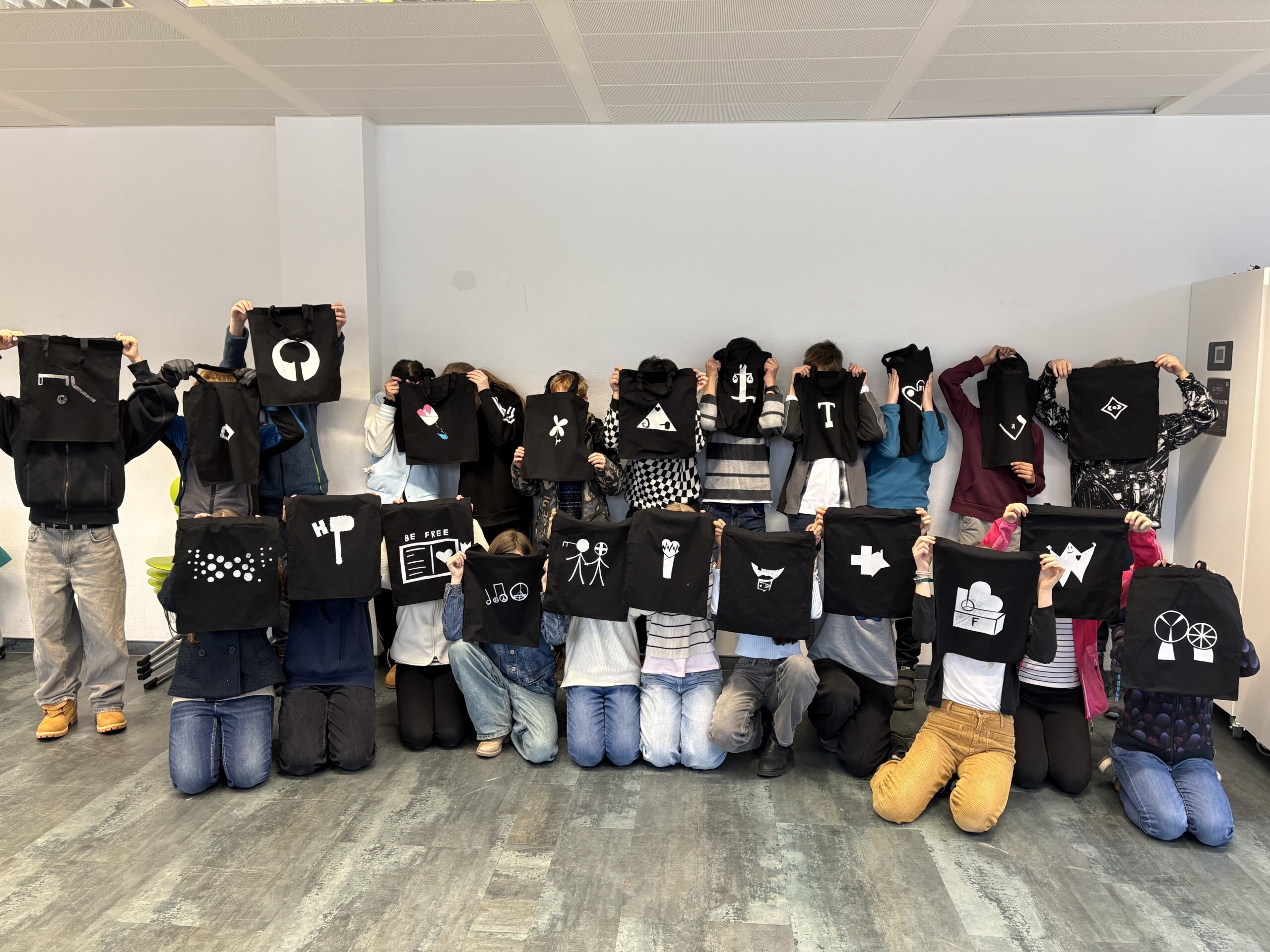 Was ist mir wichtig im Leben? Wir sollten die drei wichtigsten Aspekte auf drei verschiedene Post-its schreiben. Die meisten Schülerinnen und Schüler haben Familie und Freunde als einer der wichtigsten Werte aufgeschrieben. Im Anschluss sollten wir uns Bilder für unsere Werte überlegen und diese auf drei weitere Post-its aufmalen. Die Herausforderung kam erst noch, denn wir mussten unsere drei wichtigsten Werte zu einem Zeichen verbinden, hier brauchten wir auch Kreativität! Diese Zeichen haben wir anschließend eine Folie übertragen und auf eine schwarze Tasche gebügelt.