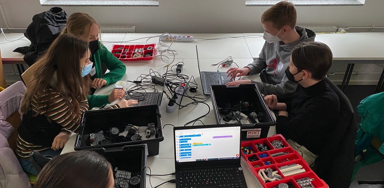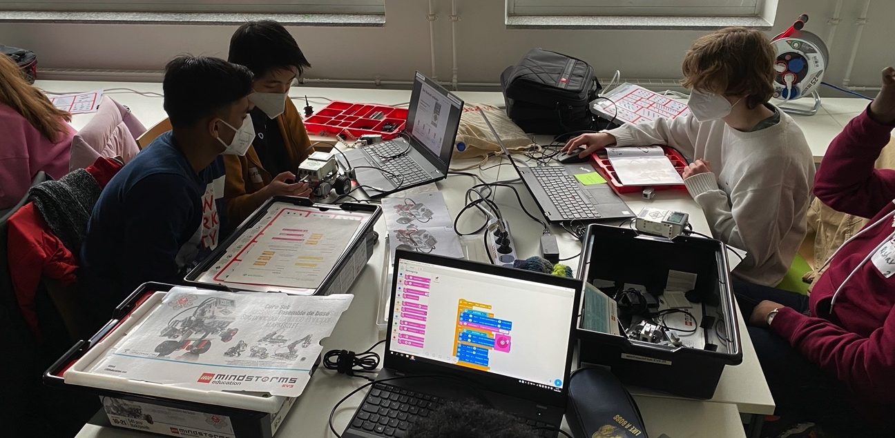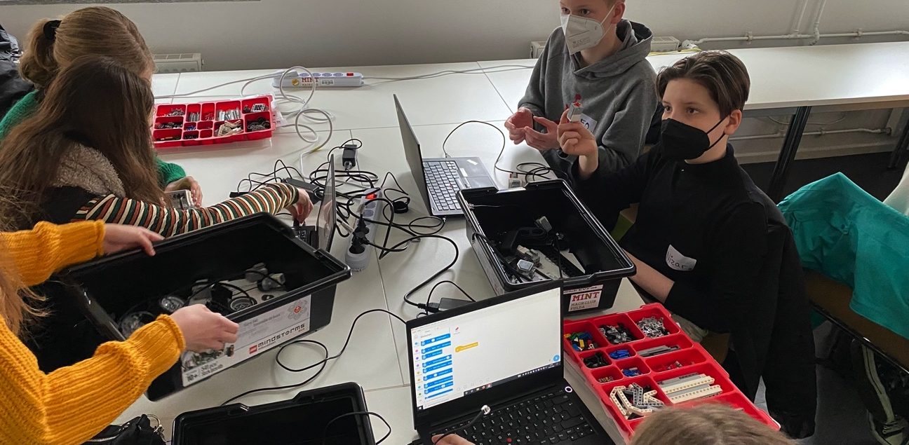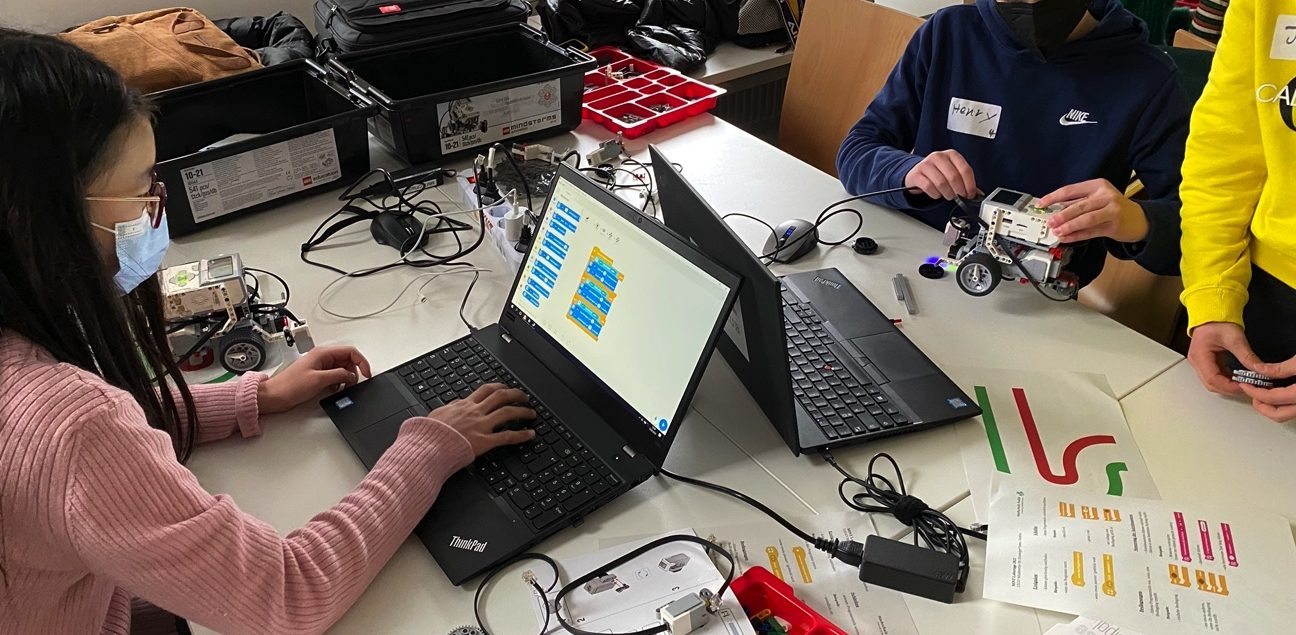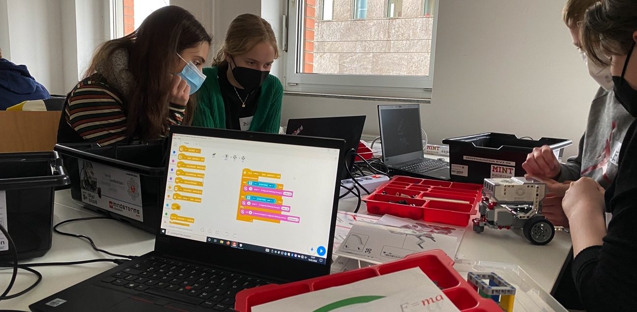 Am Anfang haben das allgemeine Thema „Robotik“ besprochen und dann haben uns die Projektleiter die ersten Schritte des Programmierens beigebracht: Dabei benutzten wir die Mindstorms Programmier-App. In erster Linie lernten wir, wie wir unterschiedliche Sensoren (Farb-, Helligkeits-, Tastsensoren) mit Aktoren verbinden und durch die Programmierung einen Motor ansteuern. Zum Beispiel war eine Aufgabe, dass die Motoren starten, wenn der Farbsensor die Farbe rot erkennt.