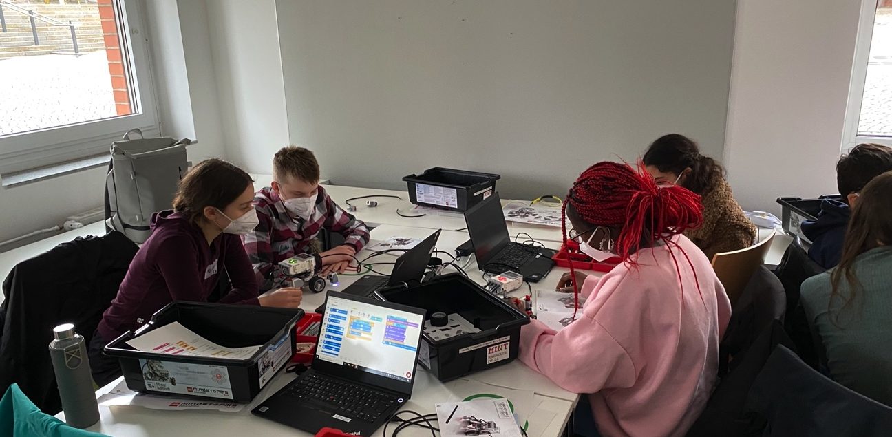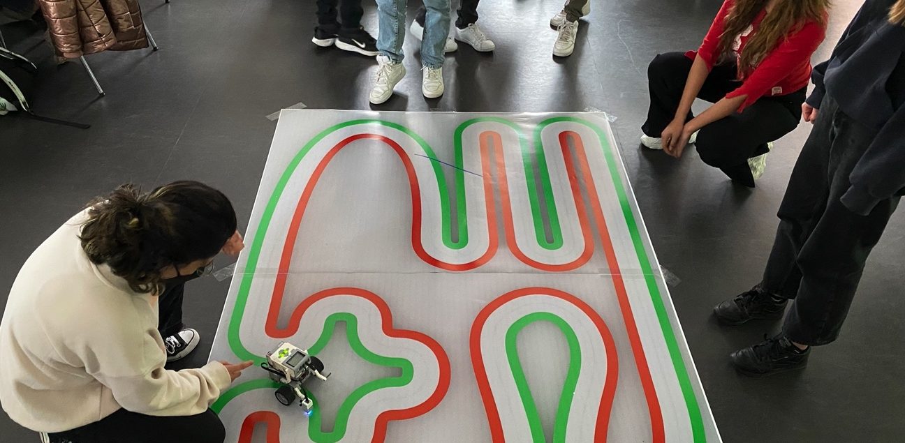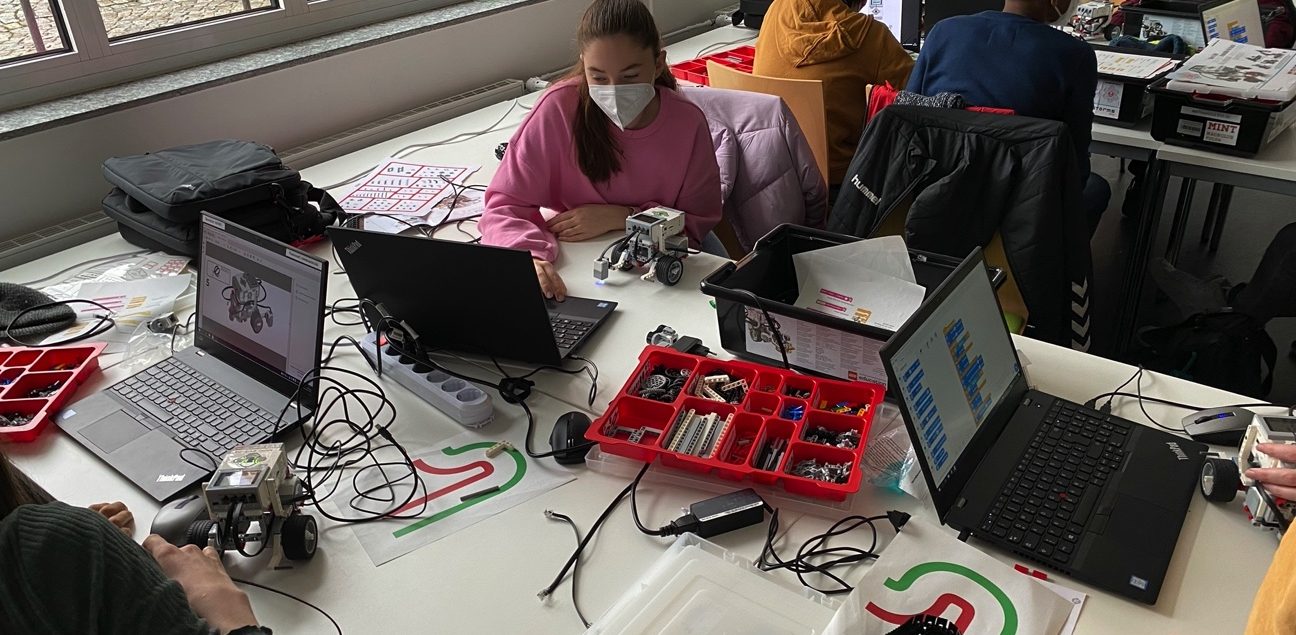 Danach gingen wir zum Aufbau der LEGO-Mindstorms Roboter über. Das Aufbauen hat vielen besonders Spaß gemacht. Dazu wurden wir in Zweiergruppen aufgeteilt und mussten die Sensoren und Motoren der einzelnen Roboter so einstellen, dass diese eine Rennstrecke fahren, ohne dabei von uns direkt gesteuert zu werden. Die Rennstrecke bestand aus einem grünen und einem roten Streifen. Ziel war es, dass der Roboter in dieser Strecke bleibt, diese also nicht verlässt und nur allein durch die Programmierung der Sensoren sich selbst steuert.