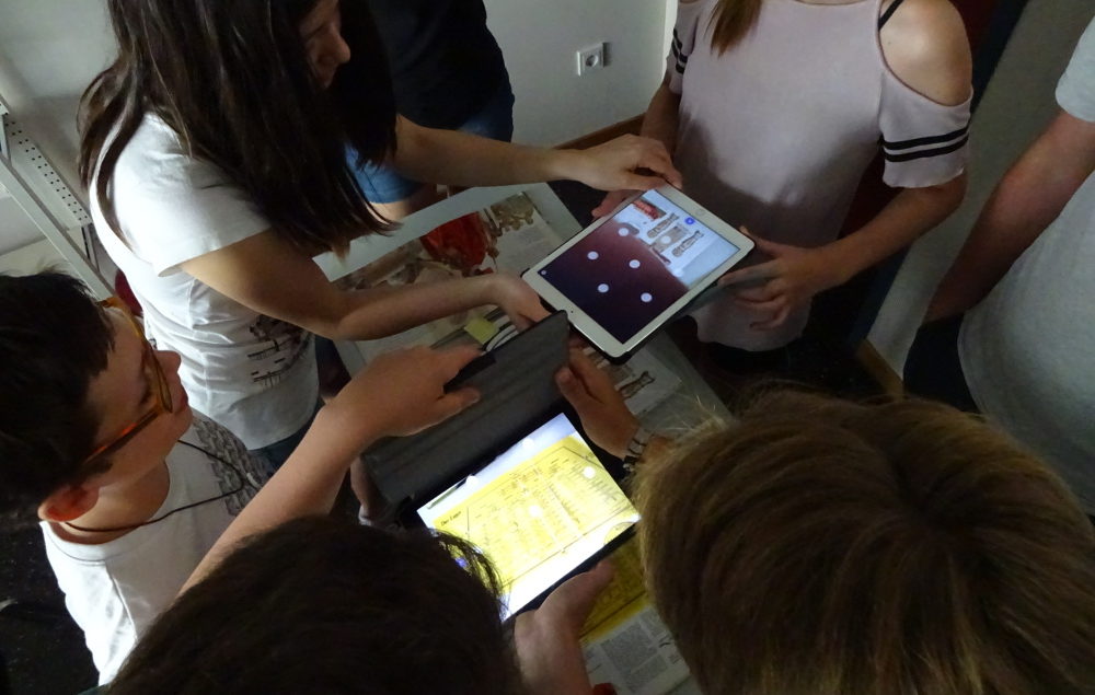 Mit Hilfe von Sachbüchern erarbeiten die Schülerinnen und Schüler der Klasse 7d in der Schulbibliothek Quizfragen rund um das Thema Altes Rom. Anschließend kamen die iPads, die die Schulbibliothekarische Arbeitsstelle zur Verfügung gestellt hatte, zum Einsatz: Die Arbeitsergebnisse wurden über die App „Aurasma“ zu einer „erweiterten Wirklichkeit“ (augmented reallity) verarbeitet und mit den Fotos in den Büchern verknüpft. So half die App in der anschließenden Quiz-Phase der Klasse bei der Beantwortung der Quizfragen. Gruppenweise scannten die Teilnehmer*innen in den ausgestellten Sachbüchern die Fotos und erhielten über die iPads – wie durch einen virtuellen Spicker – die richtigen Antworten. In einer Abschlussrunde wurden alle Fragen aus der Erinnerung beantwortet und gemeinsam besprochen.