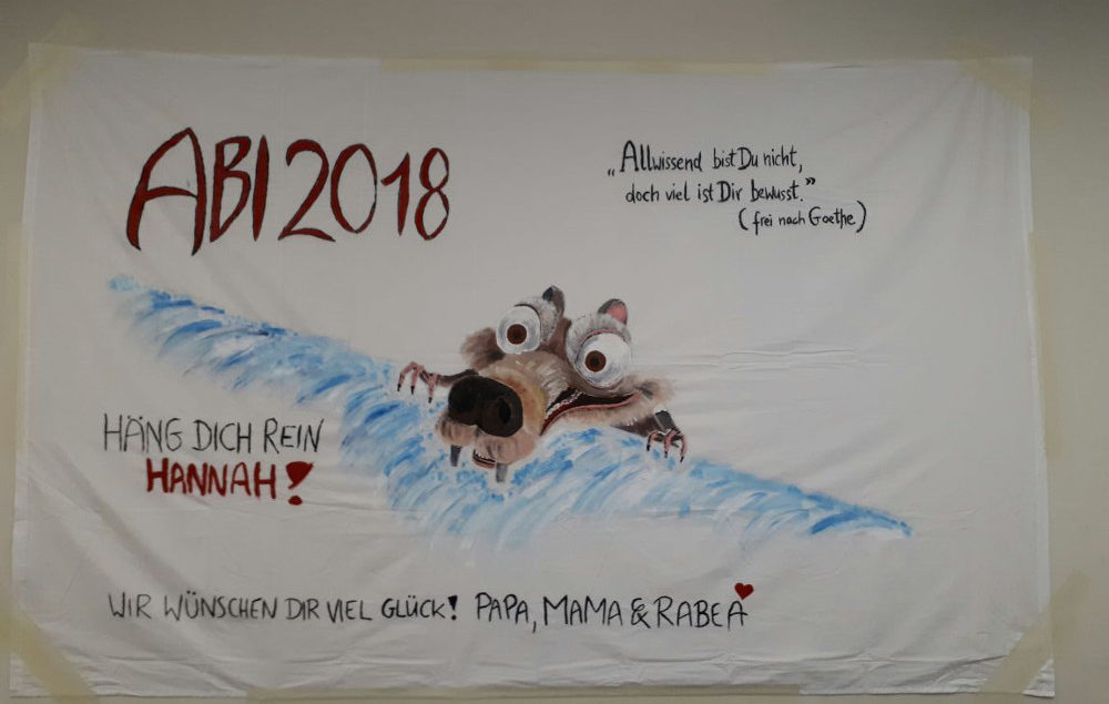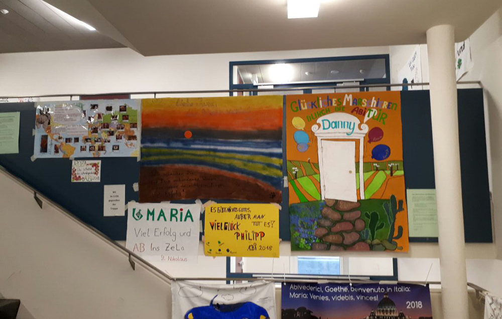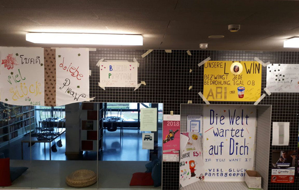 Die guten Wünsche sind schon da und sollen die Schülerinnen und Schüler auf dem Weg zur Aula stärken. Auch wir wünschen unseren Abiturientinnen und Abiturienten viel Erfolg!