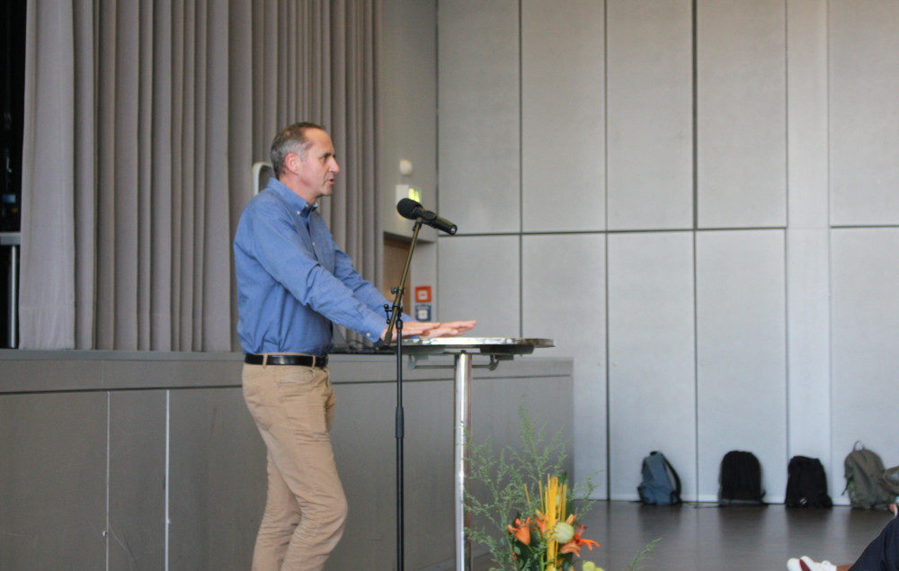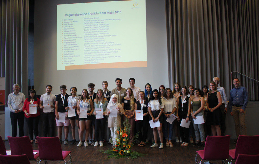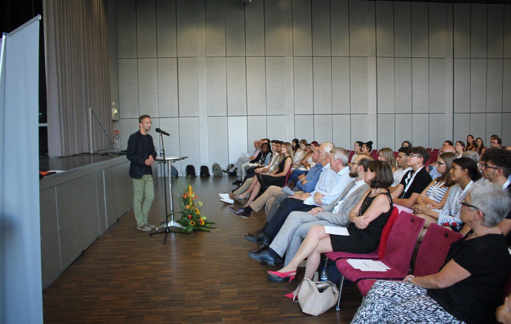2018 ist jedoch gleich in doppelter Hinsicht ein besonderes Jahr: Fünf der 20 neu aufgenommenen Stipendiatinnen und Stipendiaten aus dem Rhein-Main-Gebiet kommen von unserer Schule und zum ersten Mal fand die Aufnahmefeier am Goethe-Gymnasium statt. Am 23. August begrüßte deshalb Dr. Ulrich Hinz, Bereichsleiter Schülerförderung (Stiftung der Deutschen Wirtschaft), den neuen Studienkompass-Jahrgang in der Aula unserer Schule. Stellvertretend für die Schulleitung brachte Herr Gräff die besondere Freude darüber zum Ausdruck, wie viele Bewerberinnen und Bewerber des Goethe-Gymnasiums nach sorgfältiger Prüfung für das Programm ausgewählt wurden und dankte in diesem Zusammenhang den Studienkompass-Organisatoren für ihre Arbeit.