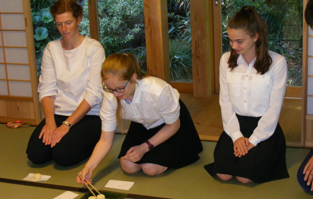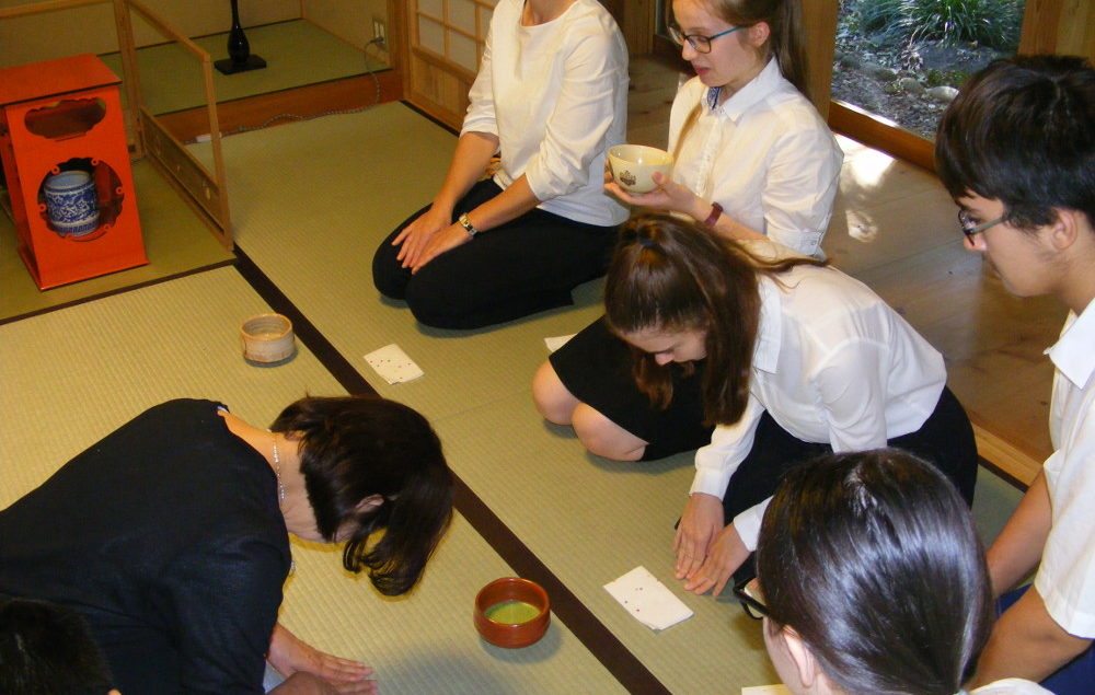 Zwölf Schülerinnen und Schüler besuchten unsere Partnerschule Tamagawa-gakuen; mit von der Partie waren Herr Dr. Kreutzer und Frau Möbius. Im Rahmen des umfangreichen Programms konnten wir auch an einer Teezeremonie im schuleigenen Teehaus teilnehmen. Die deutsche Bezeichnung Teezeremonie ist eigentlich etwas irreführend, denn es geht nicht darum, dass dem Tee in irgendeiner Weise gehuldigt würde oder dass um der Form willen ein möglichst striktes Ritual erdacht wurde. Man könnte das Geschehen auch Teezusammenkunft nennen. Dabei geht es einerseits darum, dass der Gastgeber seinen Gästen durch die Bewirtung mit Tee ein ästhetisch möglichst perfektes Erlebnis bieten möchte, wozu auch perfekte Höflichkeit und Manieren zählen (daher rührt die zeremoniell anmutende Komponente). Andererseits dient das Ganze aber eigentlich dazu, diese Zeit des Zusammenseins möglichst bewusst und kontemplativ wahrzunehmen, also um das bewusste Erleben des Hier und Jetzt. Rebecca Sassin hat die Teezusammenkunft in folgendem Text beschrieben. (Kt)