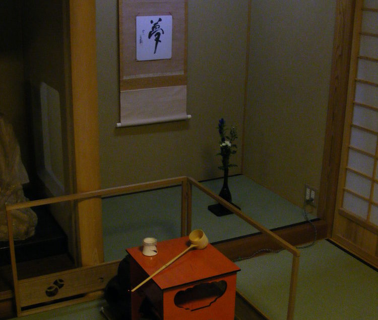 Die Teezeremonie ist ein traditionelles Zusammenkommen, bei dem der japanische Matcha aufgegossen wird und es um das Genießen der gemeinsamen Zeit geht. In einem japanischen Garten, der sich über einen Hügel erstreckt, finden wir das Teehaus der Tamagawa-Schule. Wir ziehen unsere Schuhe aus, stellen unsere Taschen ab, gehen durch traditionelle japanische Zimmer und stehen schließlich auf Tatami, japanischen Reisstrohmatten, einem traditionellen japanischen Bodenbelag. In dem Zeremonieraum befinden sich keine Möbel, sondern nur ein Kessel, in welchem das Wasser erhitzt wird, und ein kleines Gestell mit dem Matchapulver und einem Wassergefäß. Rechts davon befindet sich eine Schmucknische in der Wand mit einem kleinen schlichten Blumengesteck und einer Schriftrolle, die an der Wand hängt. Der Gründer der Tamagawa-gakuen („Edelsteinfluss-Lernpark“) hat diese Schriftrolle mit 88 Jahren geschrieben, einem besonderen Alter, da zwei Glückszahlen hintereinander stehen. „Traum“ hat er damals in schöner Kalligraphieschrift gepinselt. Das Blumengesteck hat der Gastgeber extra für uns aus einigen Chrysanthemen zusammengestellt.