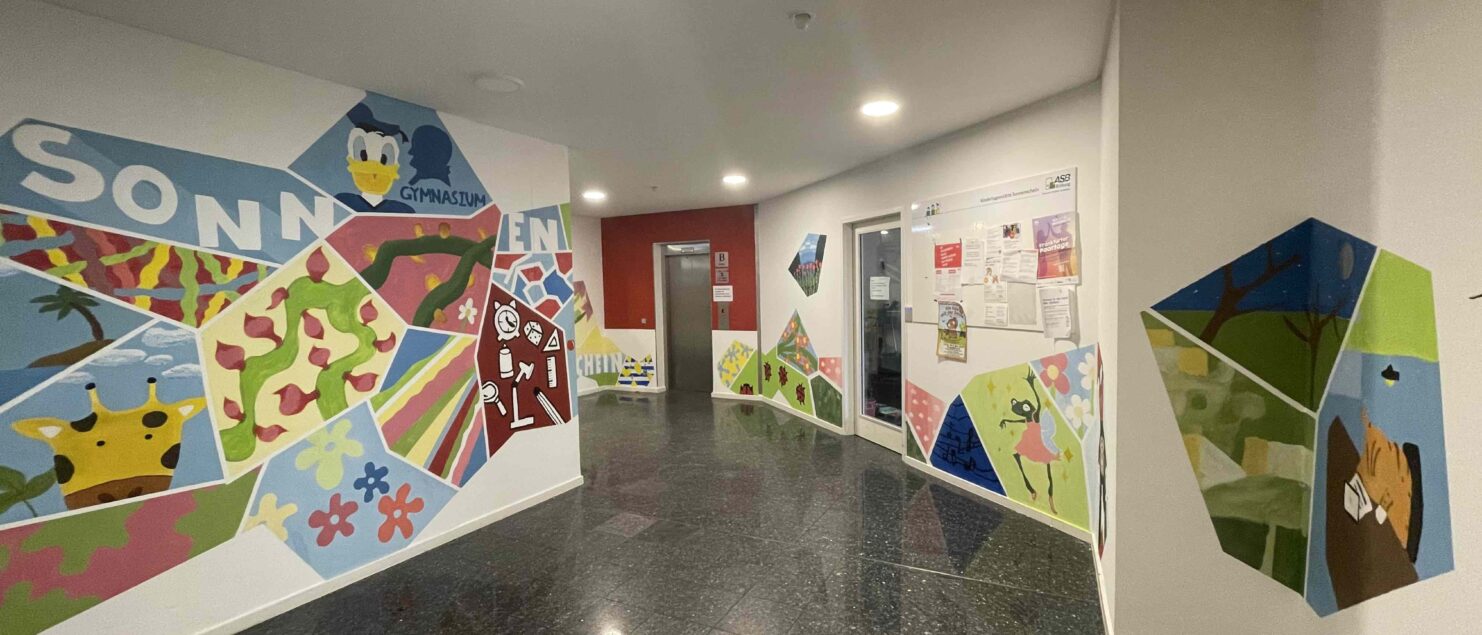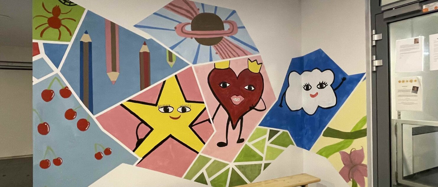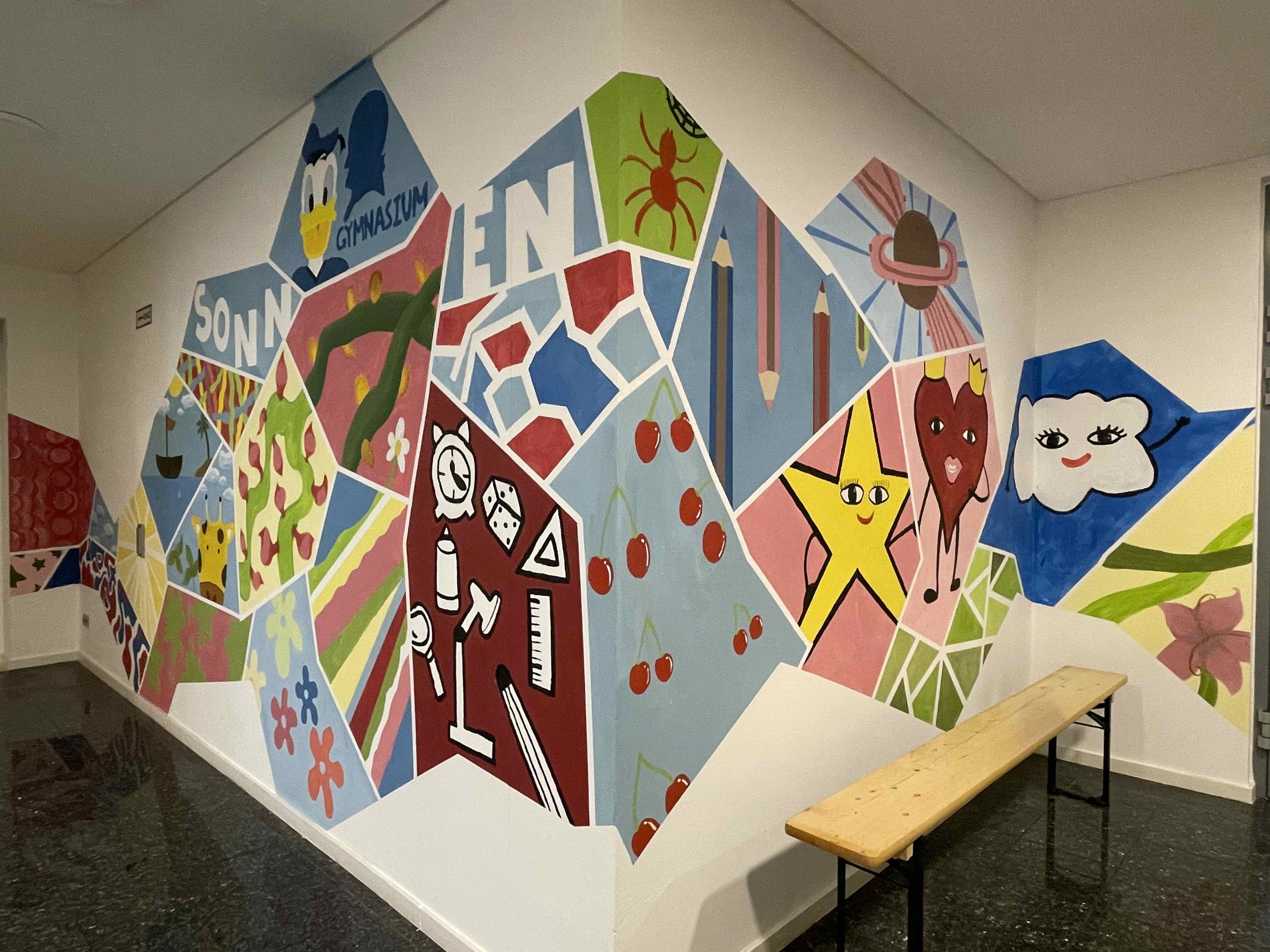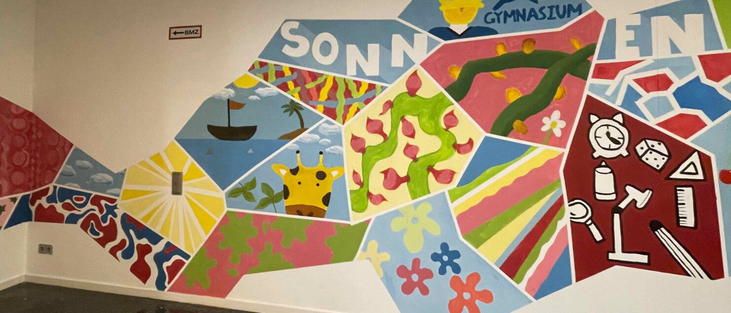 Wir, die Klasse 10B, haben über zwei Wochen in Klein-Gruppen die Wand zwischen dem Kindergarten Sonnenschein und unserer Dependance kreativ gestaltet, nachdem die Hausverwaltung, Hünersdorff Imobilien GmbH, die Idee hatte und das Projekt ermöglicht hat.